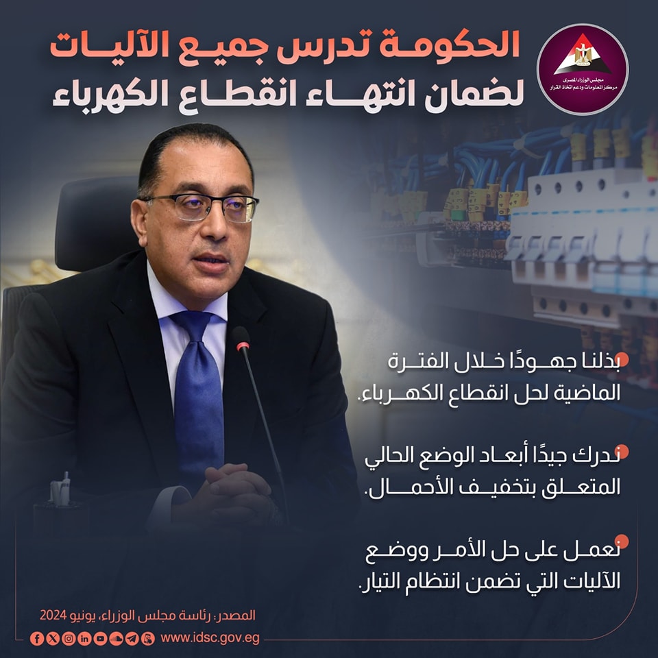 سلط مركز المعلومات ودعم اتخاذ القرار بمجلس الوزراء الضوء على الآليات التي تدرسها الحكومة لضمان انتهاء انقطاع الكهرباء.