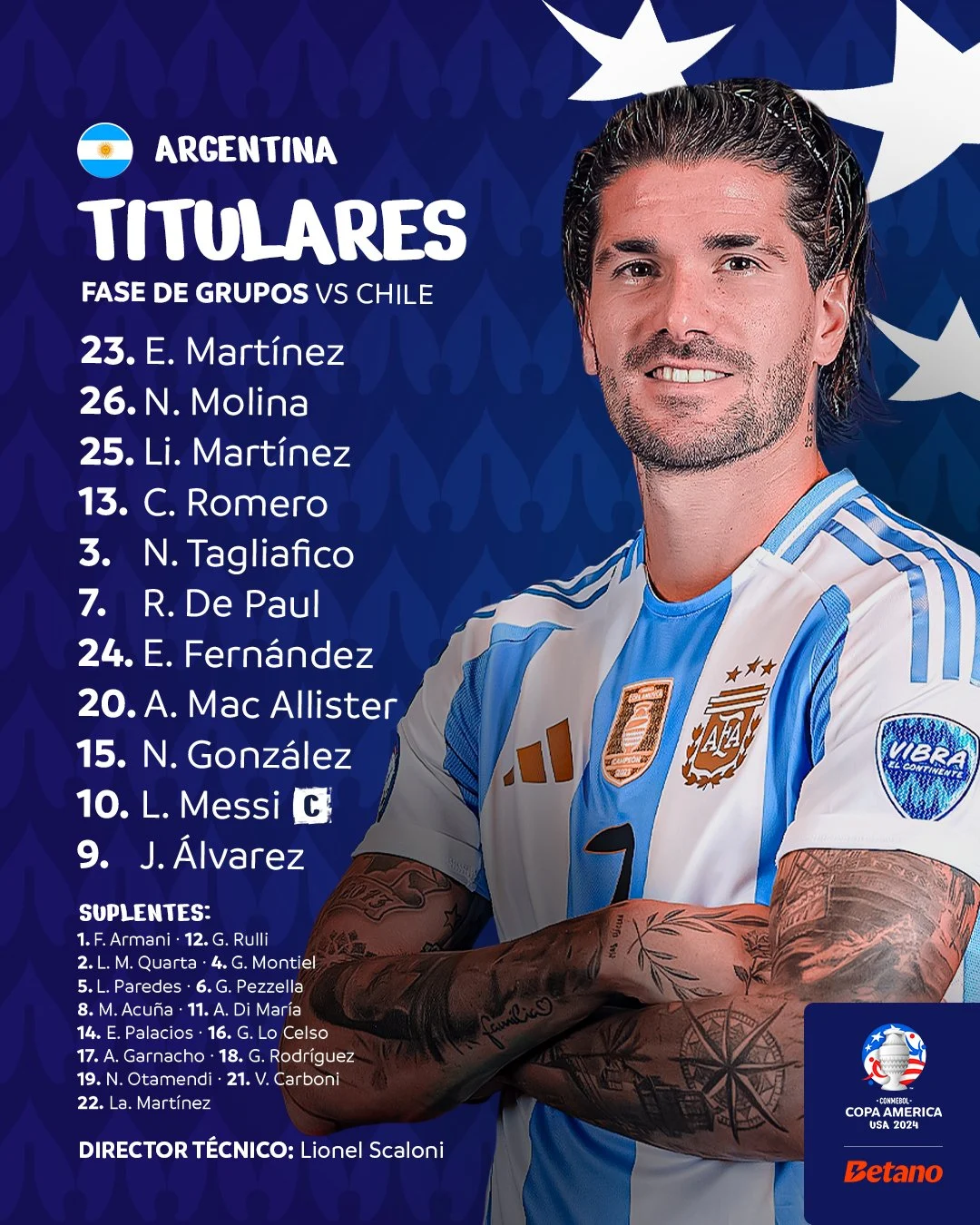 أعلن ليونيل سكالوني، وريكاردو جاريسا، مدربا المنتخب الأرجنتيني والمنتخب التشيلي، تشكيل فريقيهما للمواجهة المرتقبة بين الأرجنتين وتشيلي في الجولة الثانية من لقاءات المجموعة الأولى ببطولة كوبا أمريكا 2024.