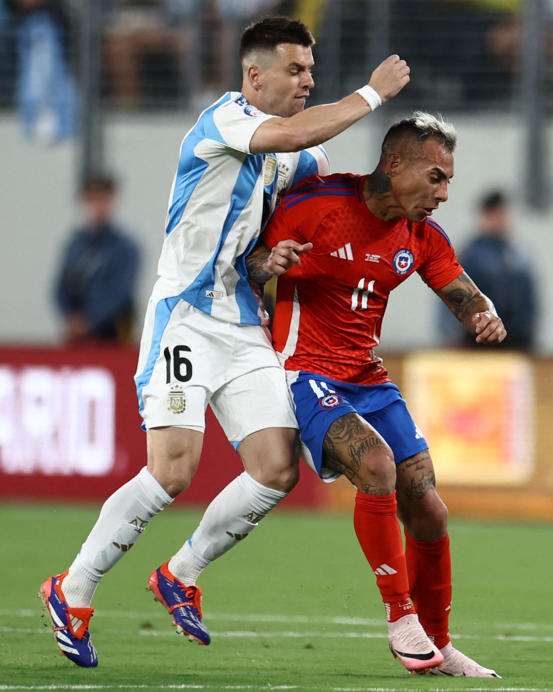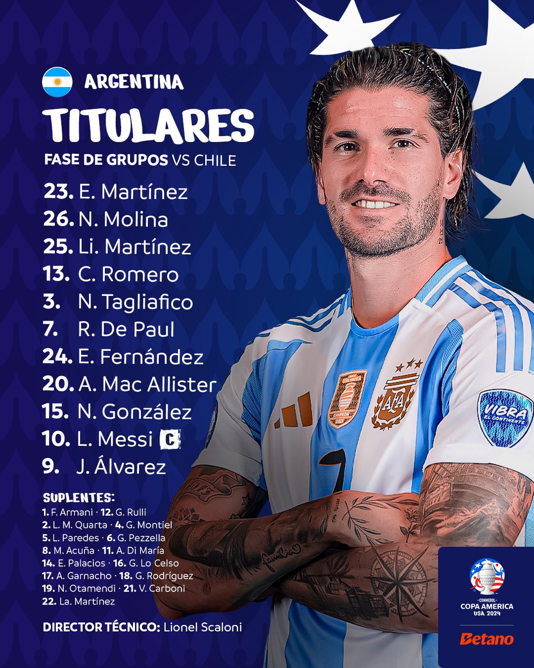 وكان ليونيل سكالوني، وريكاردو جاريسا، مدربا المنتخب الأرجنتيني والمنتخب التشيلي، قد أعلنا تشكيل فريقيهما للمواجهة المرتقبة بين الأرجنتين وتشيلي في الجولة الثانية من لقاءات المجموعة الأولى ببطولة كوبا أمريكا 2024.
