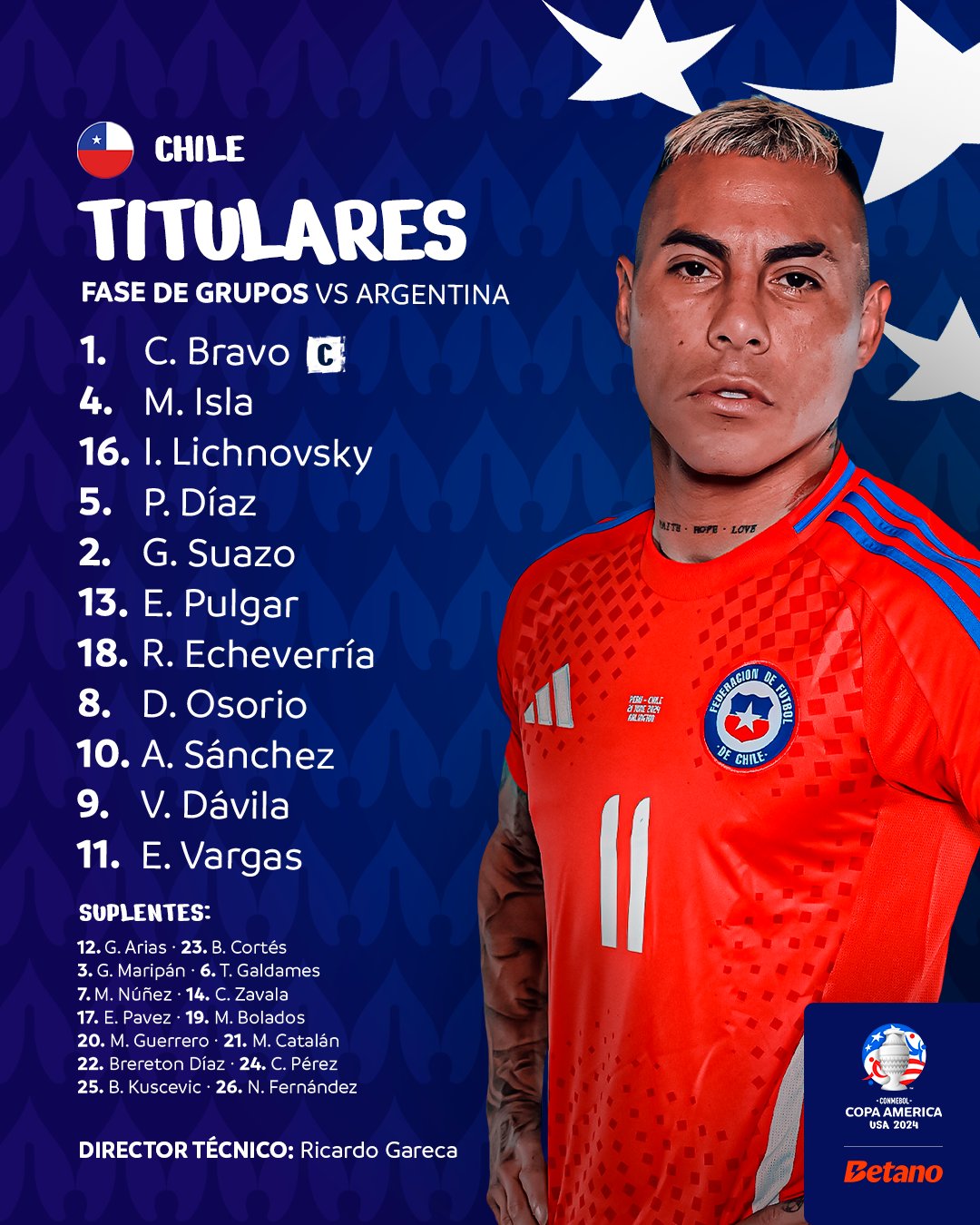 بينما جاء تشكيل المنتخب التشيلي على النحو التالي: