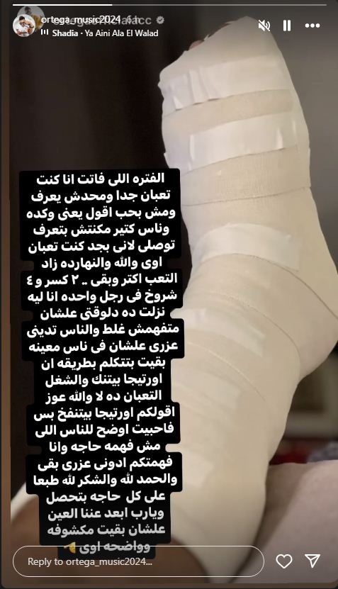 أعلن مطرب المهرجانات أورتيجا عن تعرضه لكسر في القدم، حيث كشف عن ذلك بنشر صورة من خلال خاصية القصة الصغير على موقع تبادل الصور والفيديوهات "انستجرام".