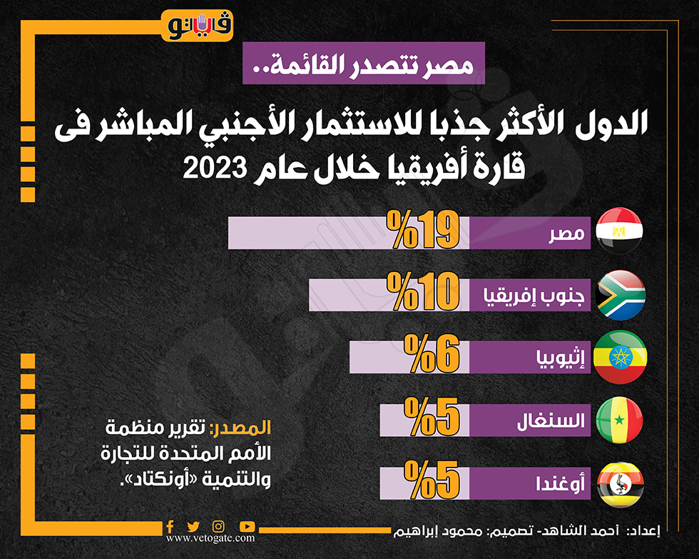 الدول الأكثر جذبا للاستثمار الأجنبي المباشر فى قارة أفريقيا خلال عام 2023 (انفوجراف) الخميس 27/يونيو/2024 - 02:00 م 6/27/2024 2:00:05 PM الاستثمارات، فيتو أحمد الشاهد شارك طباعة 18 حجم الخط شارك طباعة أونكتاد منظمة الأمم المتحدة للتجارة والتنمية الاستثمارات الأمم المتحدة للتجارة والتنمية الاستثمار الاجنبى المباشر الاستثمارات بالقارة الافريقية الدول الافريقية الاكثر جذبا للاستثمار