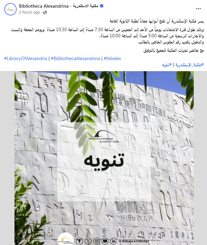 وأعلنت مكتبة الإسكندرية عن فتح أبوابها مجانًا لطلبة الثانوية العامة، وذلك طوال فترة الامتحانات يوميًا من الأحد إلى الخميس من الساعة 7:30 مساءً إلى الساعة 10:30 مساءً، ويومي الجمعة والسبت والاجازات الرسمية من الساعة 5:00 مساءً إلى الساعة 10:00 مساءً، أما الدخول فيكون بتقديم رقم الجلوس الخاص بالطالب.