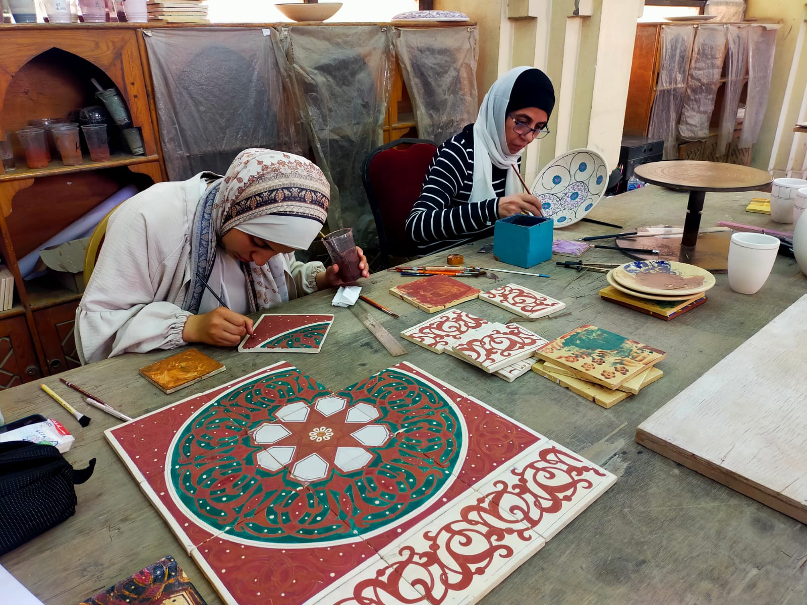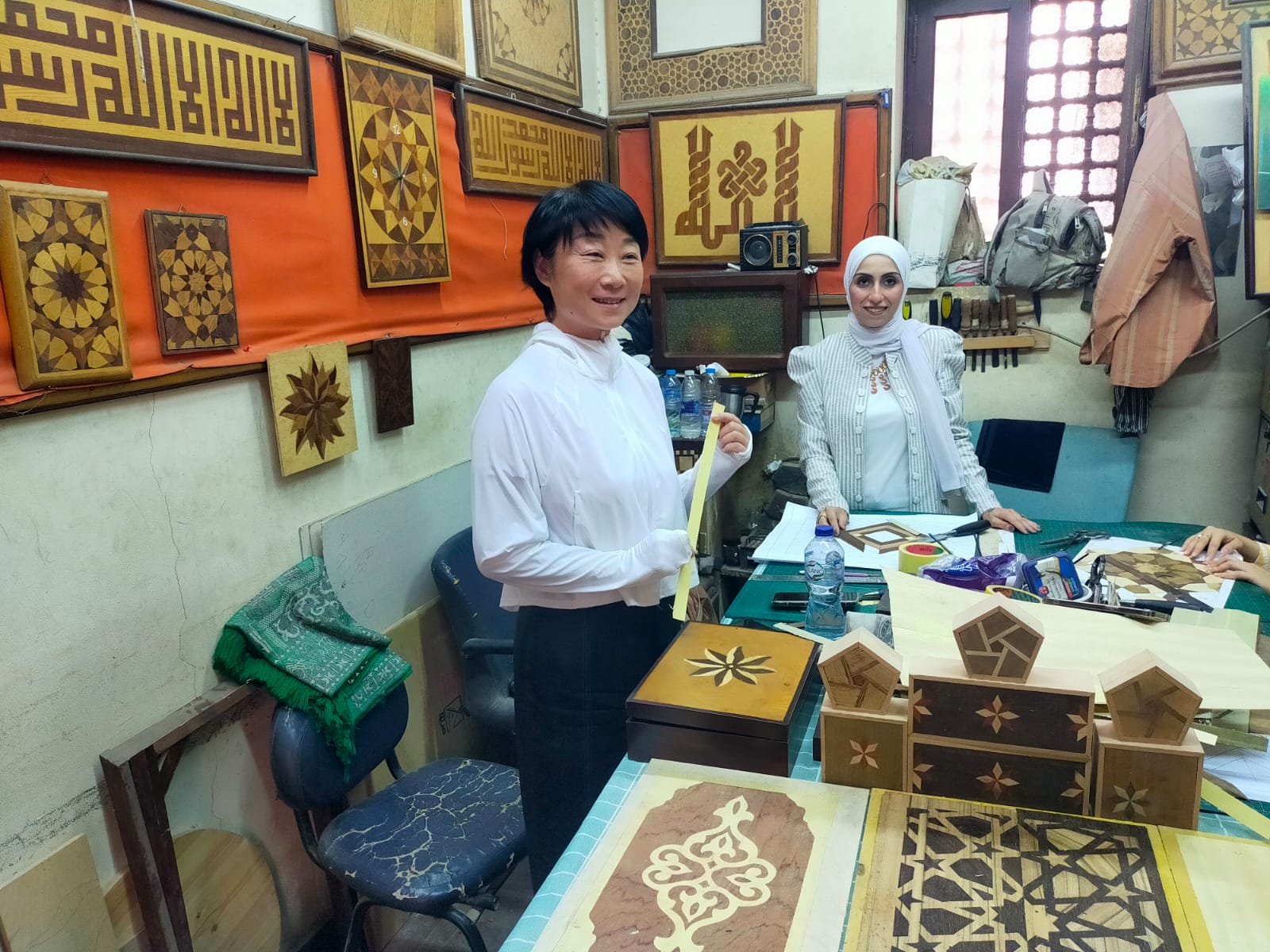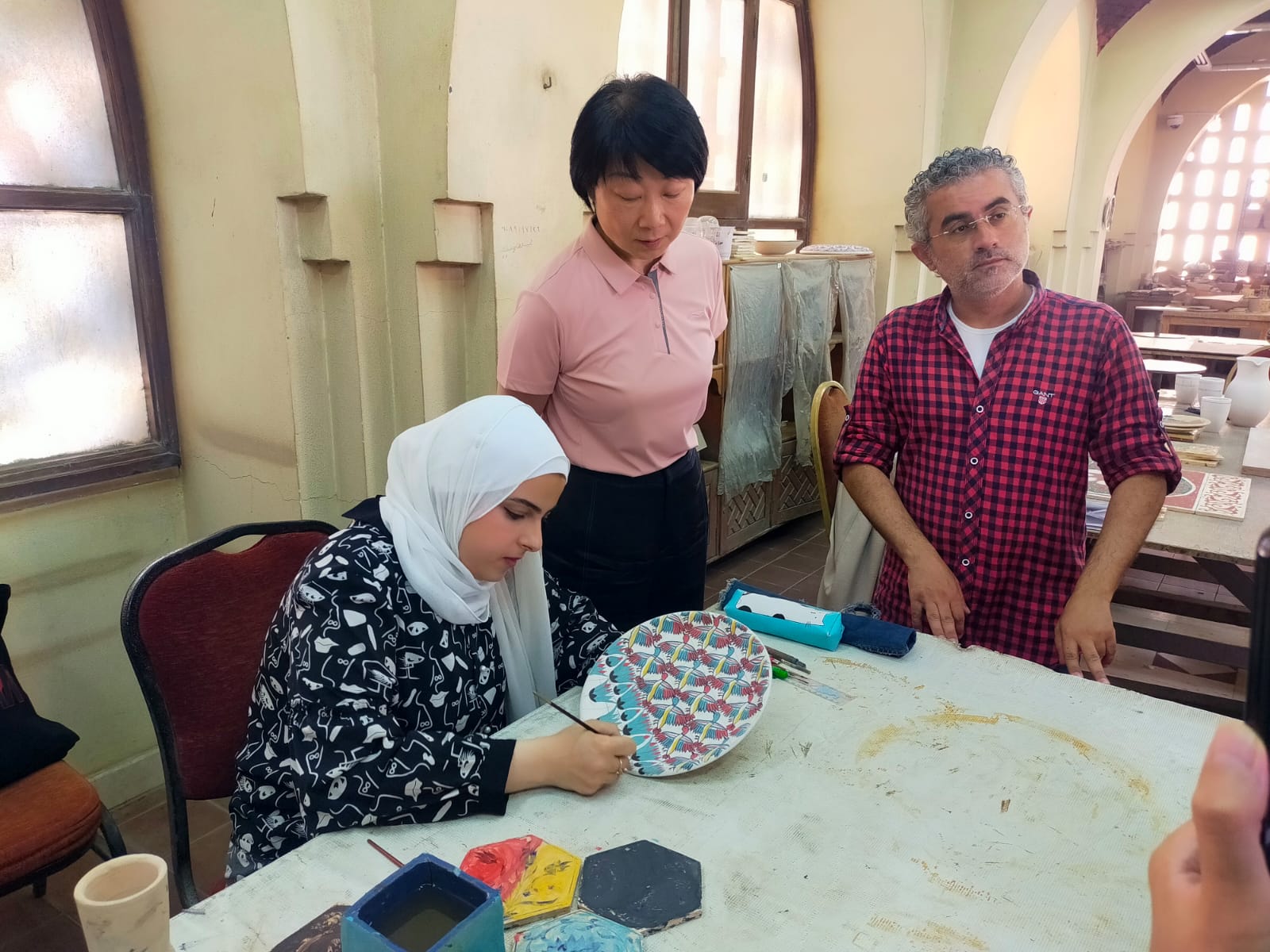 وقام الوفد بزيارة لمركز الحرف التقليدية بالفسطاط - التابع لقطاع الصندوق - حيث زاروا ورش التصنيع واتيليهات الفنانين للرسم على الخزف وتصنيعه، وكذلك أعمال النحاس والارابيسك.