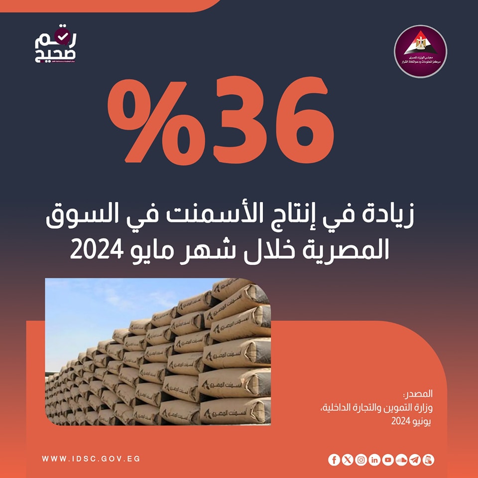سجّلت بيانات وزارة التموين والتجارة الداخلية 36% زيادة في إنتاج الأسمنت في السوق المصرية خلال شهر مايو 2024، ليسجل 3.4 ملايين طن، مقارنةً بالشهر السابق له.