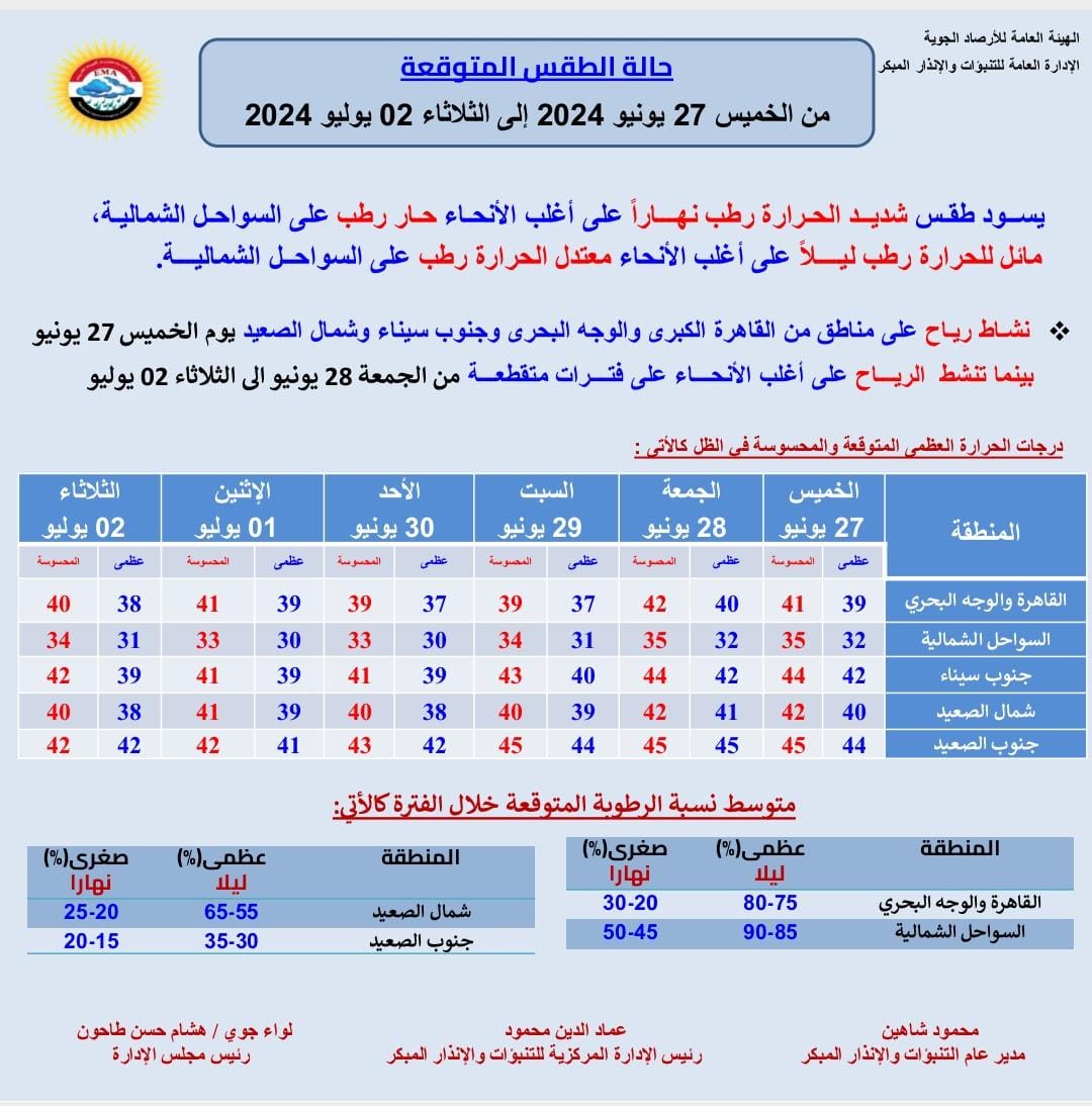 وقالت هيئة الأرصاد في بيان أنه بداية من الخميس 27 يونيو 2024 حتى الثلاثاء 2 يوليو 2024، ستشهد استمرار في ارتفاع درجات الحرارة.