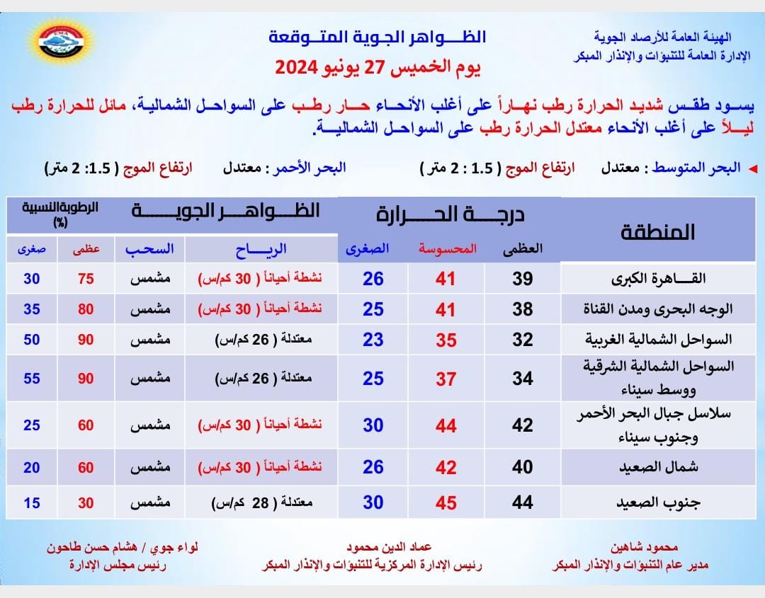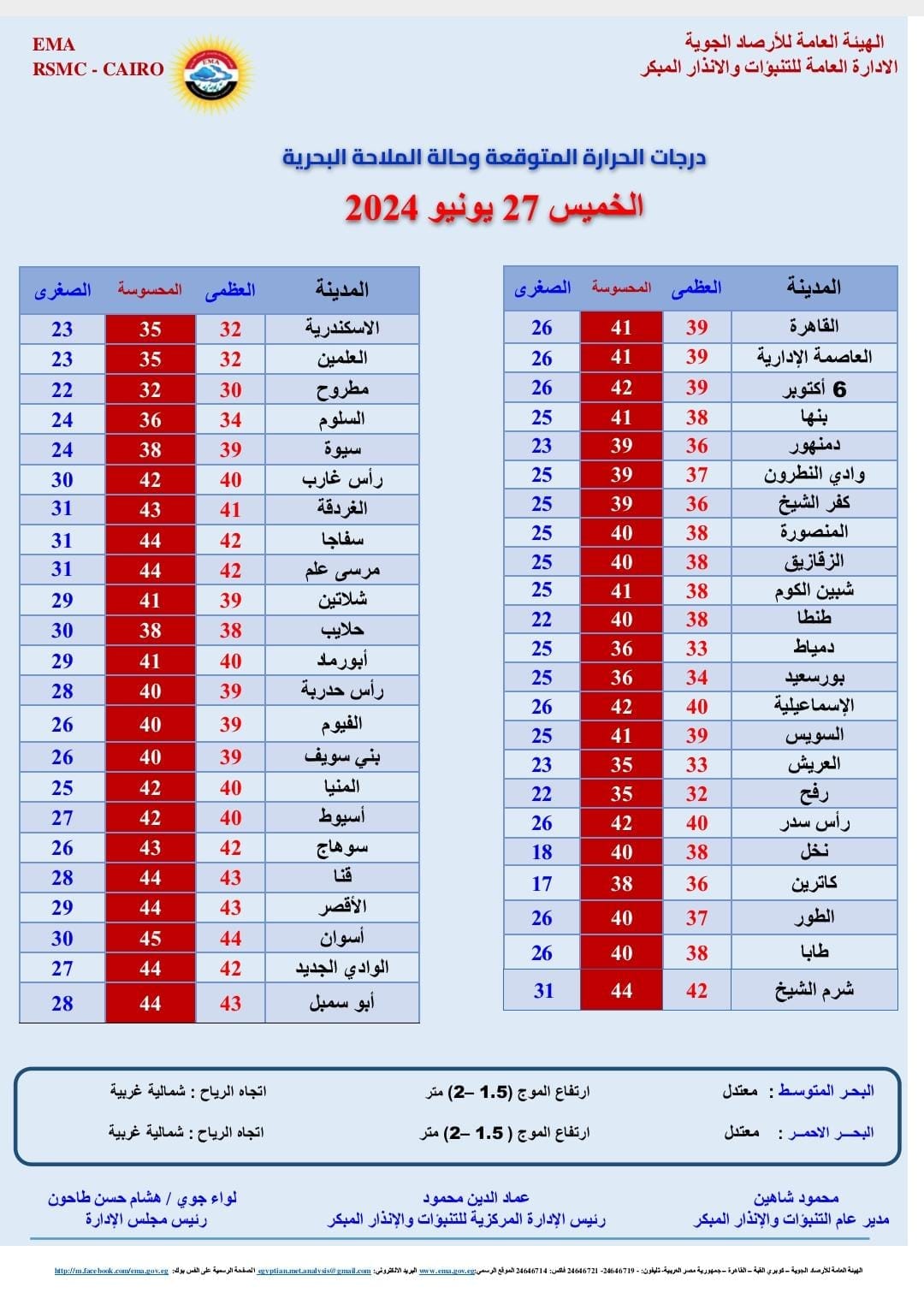 ونشرت هيئة الارصاد الجوية بيانا بدرجات الحرارة المتوقعة اليوم الخميس على مدن ومحافظات مصر، وجاءت كالتالي: