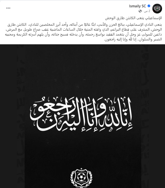 نعى النادي الإسماعيلي عبر حسابه الرسمي الكابتن طارق الوحش، المشرف على قطاع البراعم، الذي وافته المنية خلال الساعات الماضية عقب صراع طويل مع المرض.