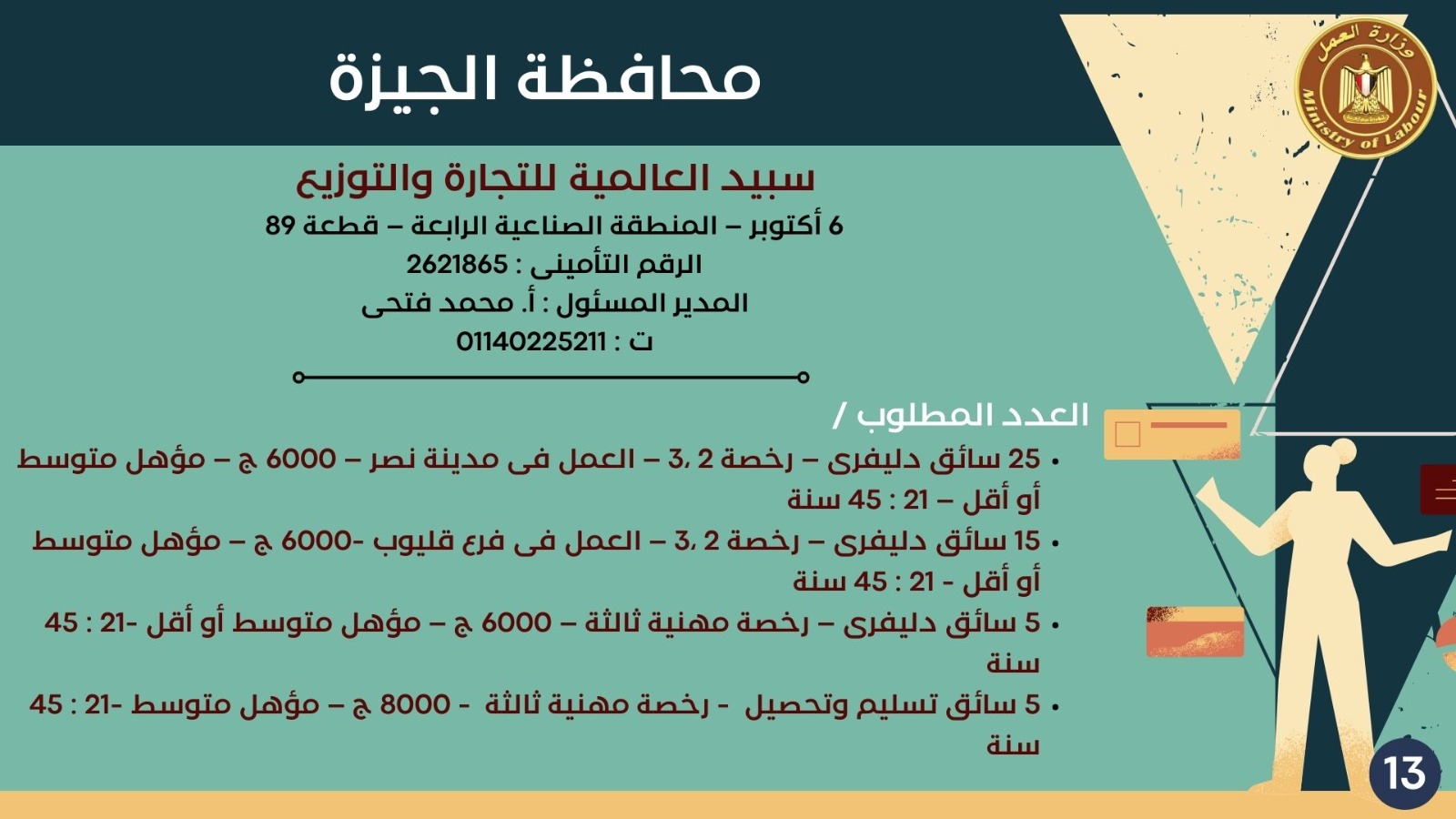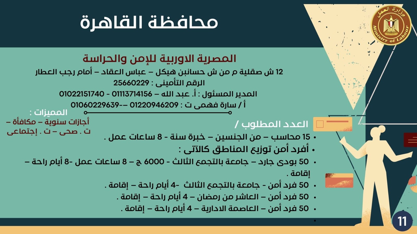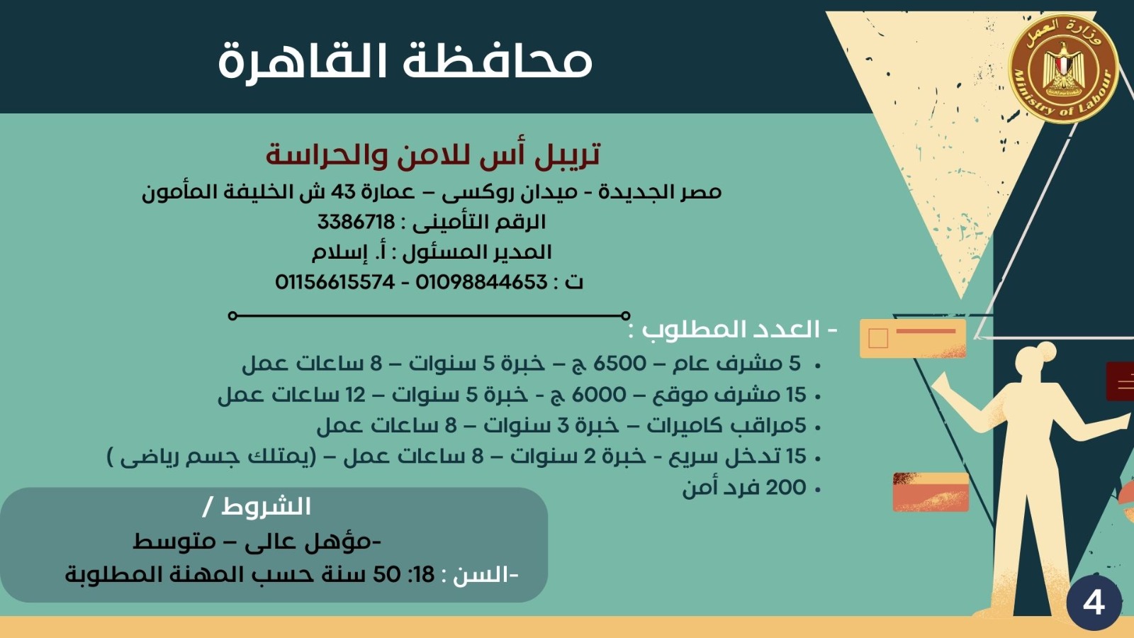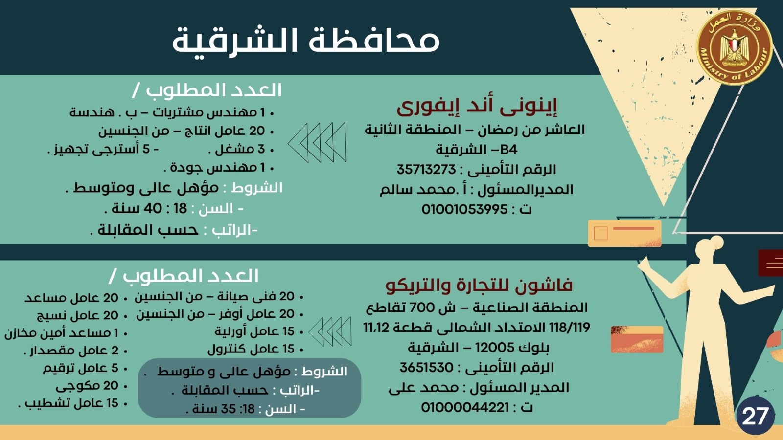 وفي تخصصات: مسئول إئتمان، ومسئول سلامة وصحة مهنية، ومحاسبين، وبائعين، ومشرف خطوط إنتاج، ومنسقين ميدانيين، وباحث إجتماعى، واخصائى تمويل، وعضو فريق، ومهندسين كهرباء وميكانيكا وإنتاج وجودة وكيميائى وزراعى، وسكرتارية، وأعمال إدارية، وأمين مخازن، وسائقين رخصة أولى وثانية وثالثة،ودليفرى وتسليم، وبودى جارد، وتدخل سريع،ومندوبين مبيعات،ومراقبين جودة،وبائعين، وفنيين جميع التخصصات، ومشرفي إنتاج، وأفراد أمن، وعمال خياطة بكافة الأقسام،وعمال انتاج، وعمال نظافة، وتخصصات أخرى.