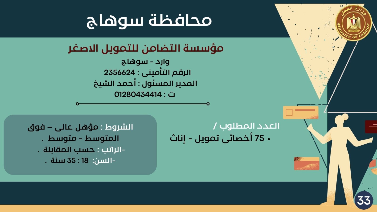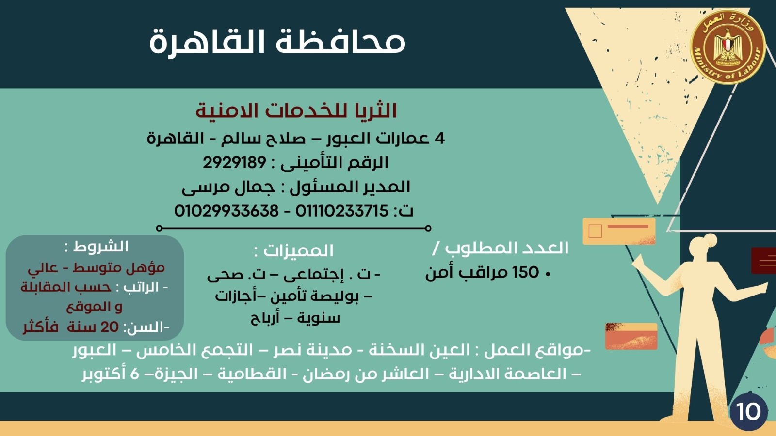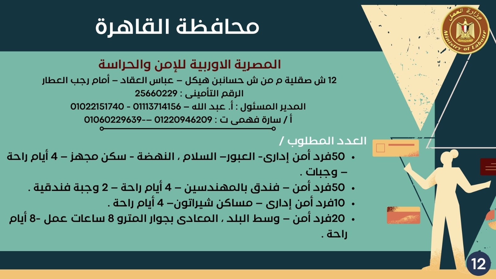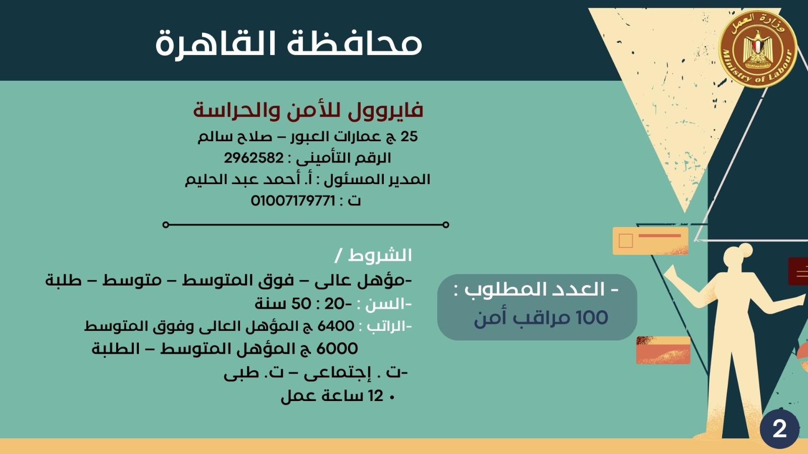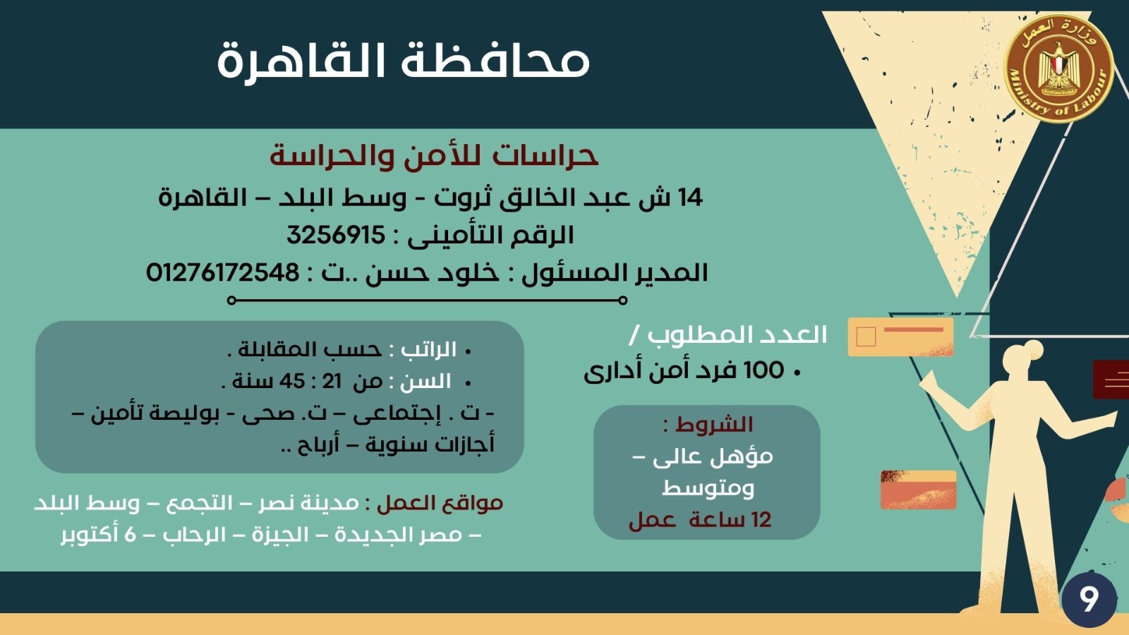 وفي تخصصات: مسئول إئتمان، ومسئول سلامة وصحة مهنية، ومحاسبين، وبائعين، ومشرف خطوط إنتاج، ومنسقين ميدانيين، وباحث إجتماعى، واخصائى تمويل، وعضو فريق، ومهندسين كهرباء وميكانيكا وإنتاج وجودة وكيميائى وزراعى، وسكرتارية، وأعمال إدارية، وأمين مخازن، وسائقين رخصة أولى وثانية وثالثة،ودليفرى وتسليم، وبودى جارد، وتدخل سريع،ومندوبين مبيعات،ومراقبين جودة،وبائعين، وفنيين جميع التخصصات، ومشرفي إنتاج، وأفراد أمن، وعمال خياطة بكافة الأقسام،وعمال انتاج، وعمال نظافة، وتخصصات أخرى.