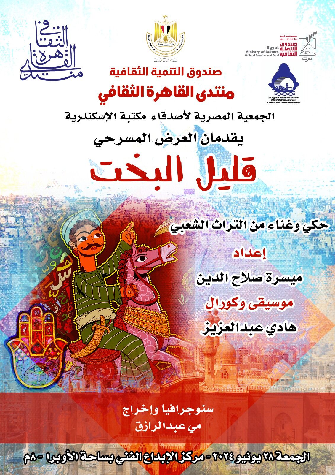 في إطار خطة وزارة الثقافة بتقديم العروض التراثية والحفظ على التراث الشعبي، يقيم قطاع صندوق التنمية الثقافية، برئاسة الدكتور وليد قانوش، بالاشتراك مع جمعية أصدقاء مكتبة الاسكندرية، أمسية جديدة من أمسيات منتدى القاهرة الثقافي، الذي يعده ويشرف عليه الشاعر سامح محجوب، في السابعة مساء غدا الجمعة الموافق ٢٨ يونيو الجاري بمركز الابداع الفني، العرض المسرحي "قليل البخت".
