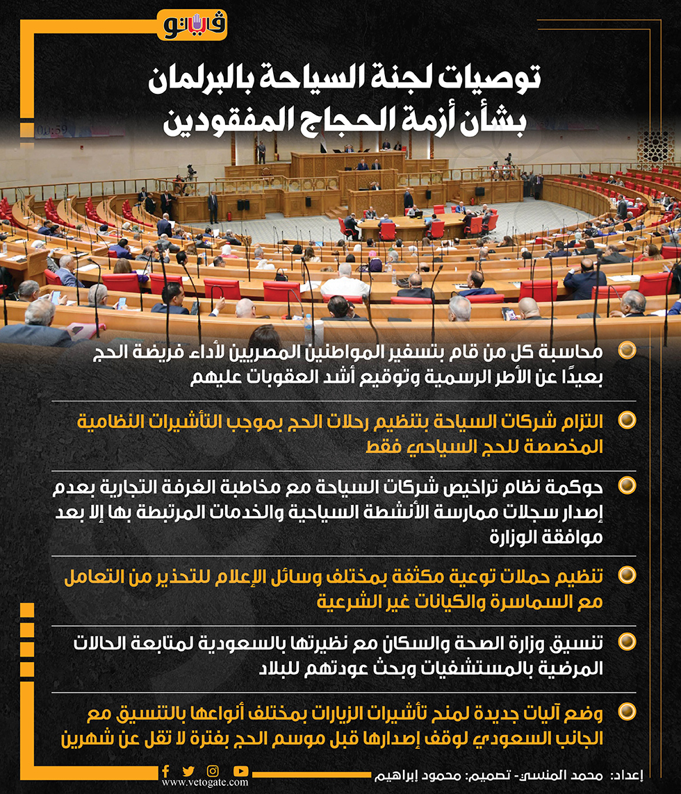توصيات لجنة السياحة بالبرلمان بشأن أزمة الحجاج المفقودين (إنفوجراف) الخميس 27/يونيو/2024 - 05:00 م 6/27/2024 5:00:17 PM مجلس النواب، فيتو محمد المنسي شارك طباعة 18 حجم الخط شارك طباعة أزمة الحجاج الانشطة السياحية الحجاج المفقودين رحلات الحج شركات السياحة فريضة الحج لجنة السياحة بالبرلمان لجنة السياحة بمجلس النواب