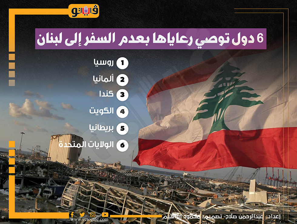 6 دول توصي رعاياها بعدم السفر إلى لبنان (إنفوجراف) الخميس 27/يونيو/2024 - 07:00 م 6/27/2024 7:00:40 PM لبنان، فيتو عبدالرحمن صلاح شارك طباعة 18 حجم الخط شارك طباعة لبنان روسيا ألمانيا كندا الكويت بريطانيا الولايات المتحدة