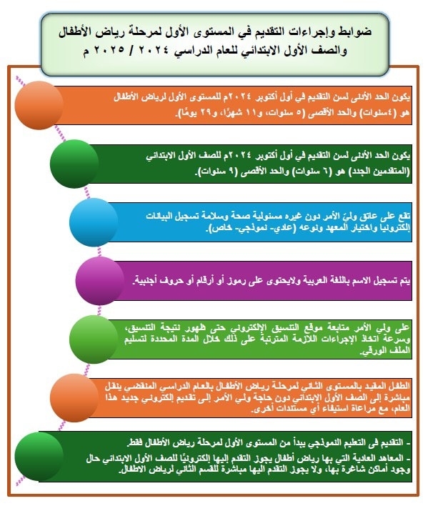 -يكون الحد الأدنى لسن التقديم في أول أكتوبر ۲۰۲٤ م للمستوى الأول لرياض الأطفال هو (٤) سنوات) والحد الأقصى (5) سنوات، و۱۱ شهرا، و۲۹ يوما).