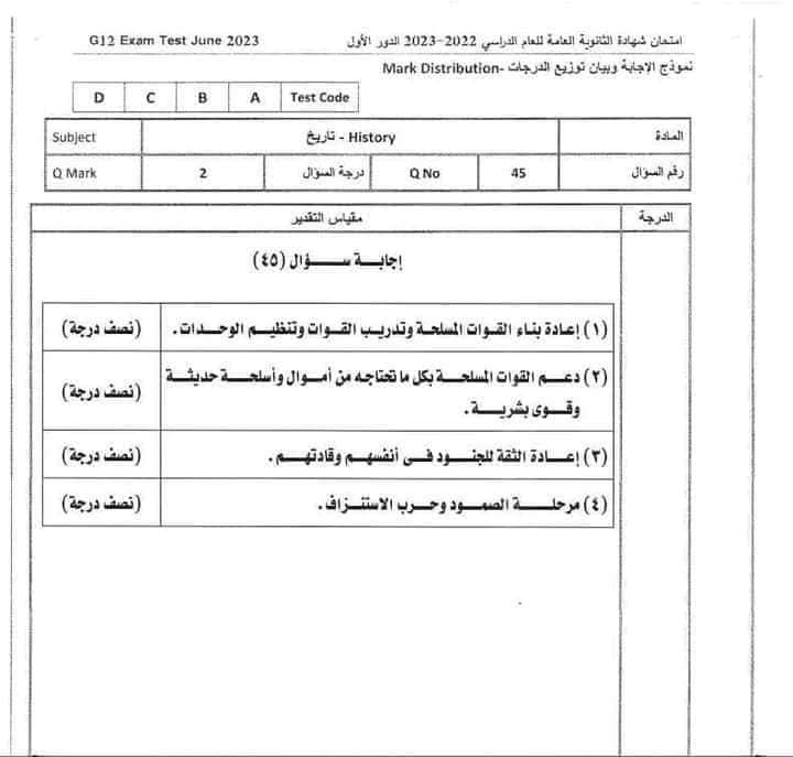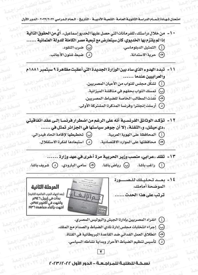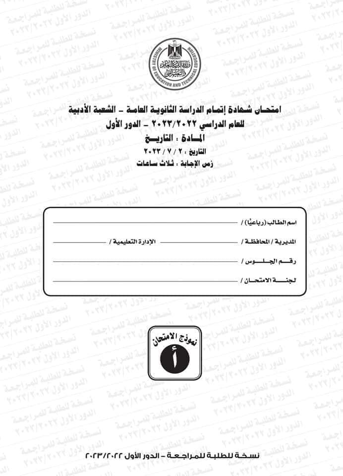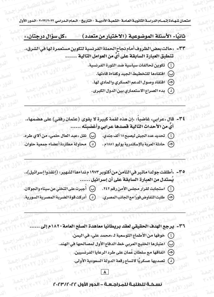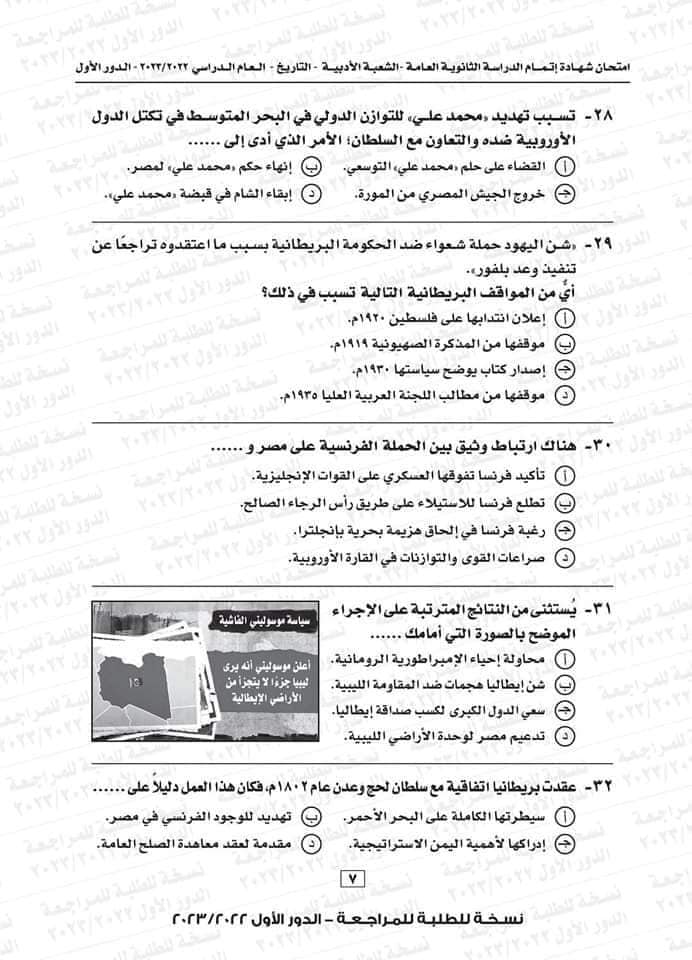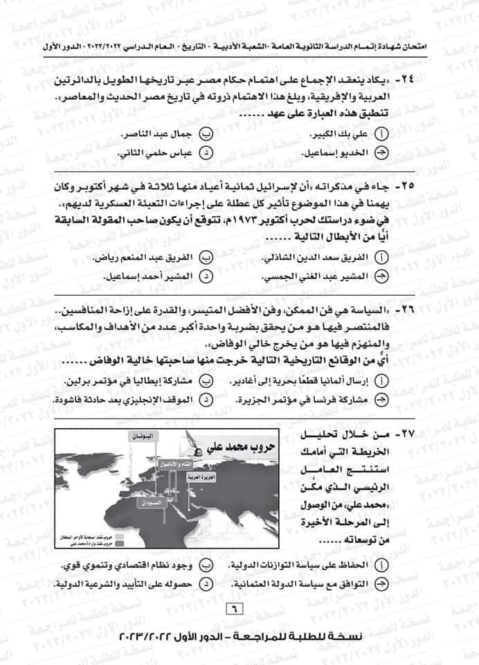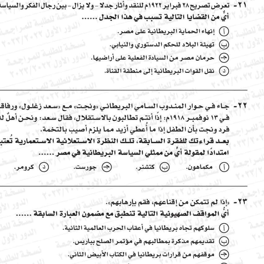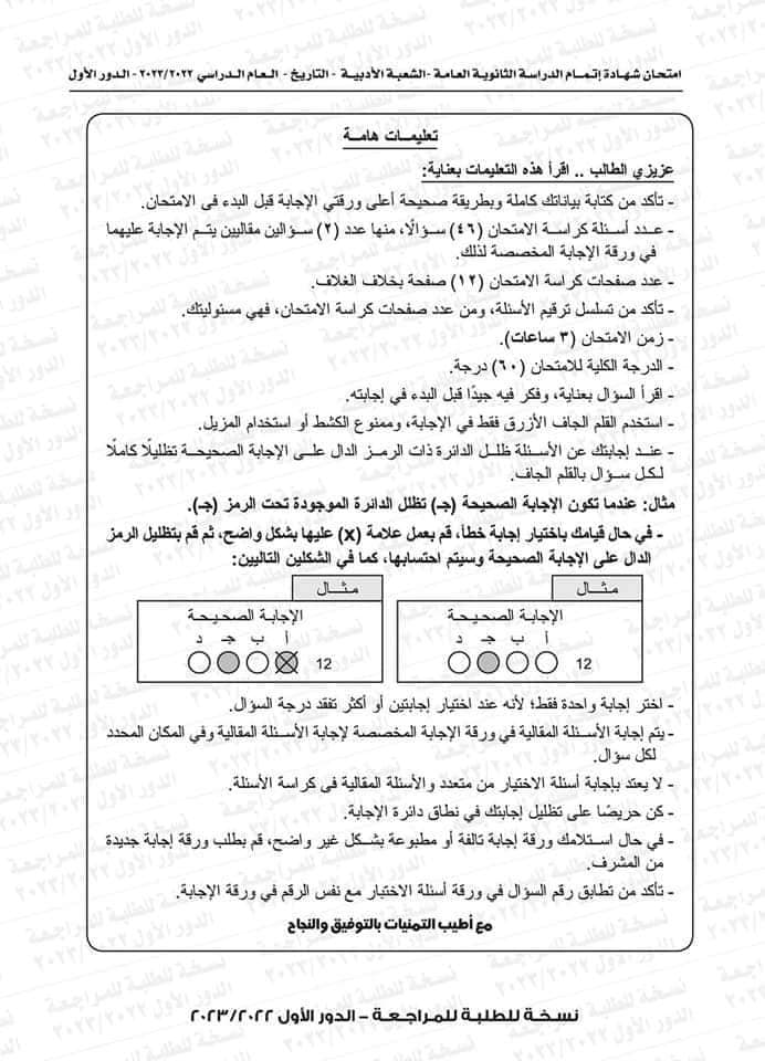 نموذج امتحان التاريخ العام الماضي 2023 لطلاب الثانوية العامة