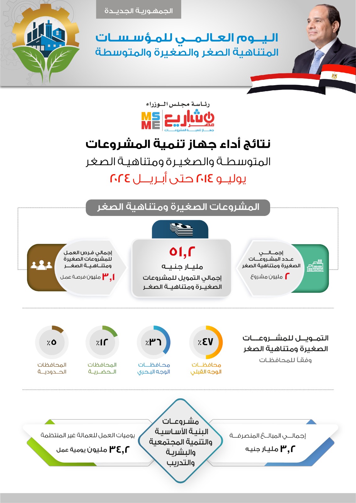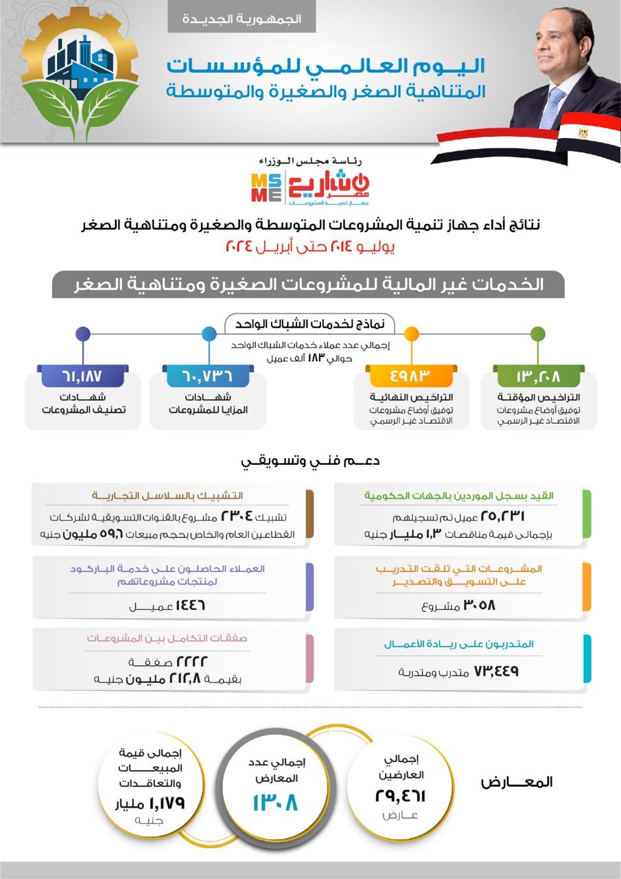 وأشار رحمي إلى قيام الجهاز بضخ تمويلات للمشروعات الصغيرة ومتناهية الصغر بإجمالي 51.2 مليار جنيه وذلك خلال الفترة من يوليو 2014 وحتى نهاية شهر إبريل 2024 (ما يقارب من 10 سنوات)، مشيرا إلى أنه تم توجيه تلك التمويلات إلى نحو 2 مليون مشروع صغير ومتناهي الصغر ووفرت نحو 3.1 مليون فرصة عمل.