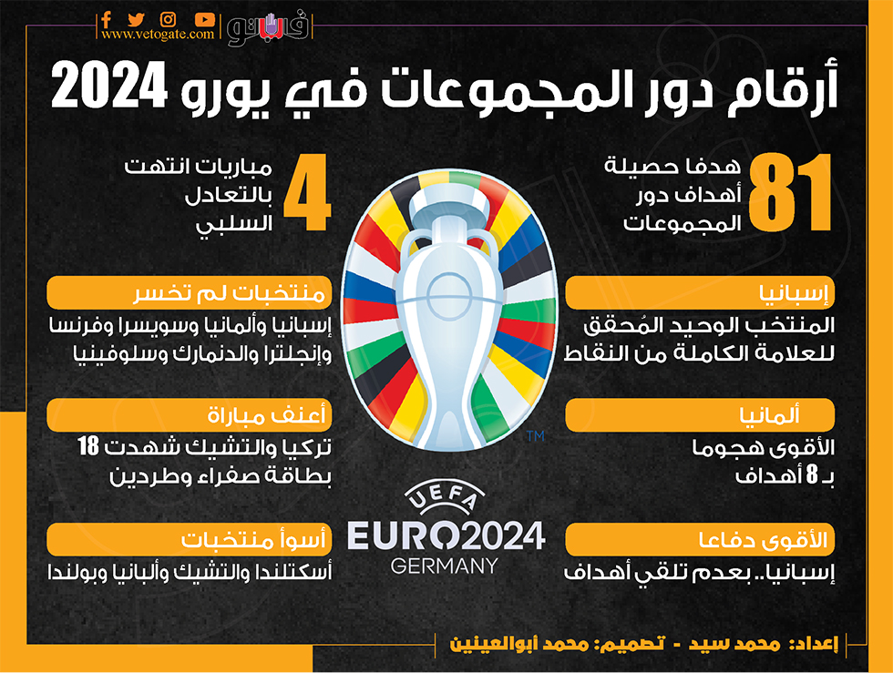 أرقام دور المجموعات في يورو 2024 (إنفوجراف) الجمعة 28/يونيو/2024 - 06:24 م 6/28/2024 6:24:59 PM يوو 2024، فيتو محمد سيد شارك طباعة 18 حجم الخط شارك طباعة يورو 2024 اسبانيا ألمانيا تركيا التشيك فرنسا