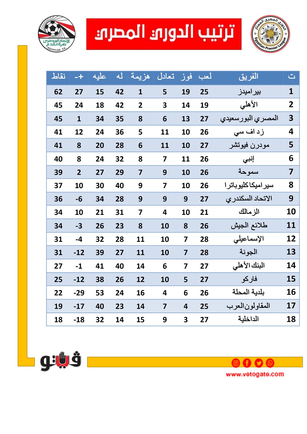 وجاء جدول ترتيب الدوري المصري الممتاز بعد مباريات اليوم كالتالي:
