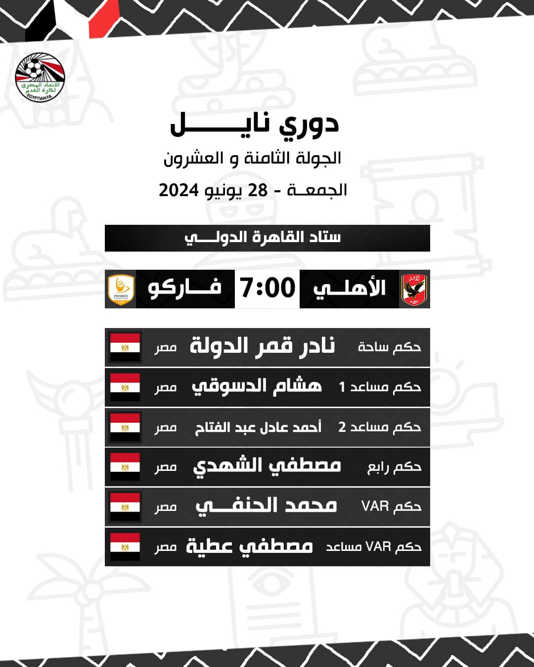 الدوري المصري، أعلنت لجنة الحكام الرئيسية باتحاد الكرة عن طاقم حكام مباراة الأهلي وفاركو في الجولة الـ 28 لبطولة الدوري المصري الممتاز المقرر لها غدا الجمعة.