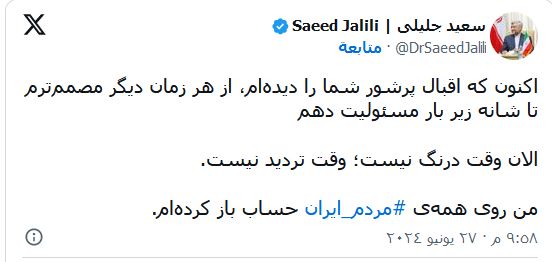 ونفى سعيد جليلي صحة هذه الأخبار، عبر تدوينة على منصة "إكس"، أكد فيها عزمه على "تحمل عبء المسؤولية" بسبب "الدعم العاطفي" من الشعب.