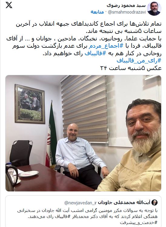 وبعد ساعات، نشرت وسائل إعلام، تقارير عن انسحاب محمد باقر قاليباف لصالح سعيد جليلي، لينفي رئيس الحملة الانتخابية لقاليباف "علي نيكزاد" صحة هذه التقارير.