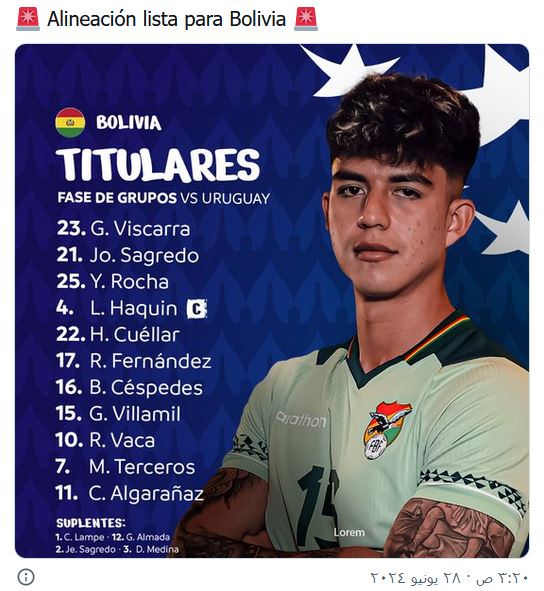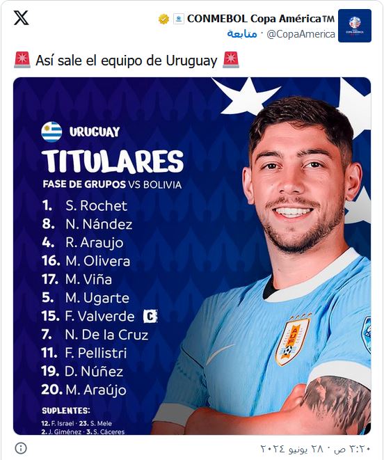 التشكيل الرسمي لمباراة أوروجواي وبوليفيا في كوبا أمريكا 2024