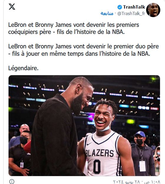 كشفت تقارير إخبارية أن أسطورة كرة السلة العالمية، ونجم فريق لوس أنجلوس ليكرز، ليبرون جيمس سيصبح أول لاعب كرة سلة محترف في العالم يلعب جنبًا إلى جنب مع ابنه، وذلك بعد التحاق بروني جيمس، نجل ليبرون بفريق لايكرز ضمن دوري كرة السلة الأمريكي للمحترفين.