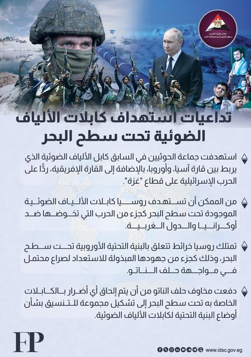 كشف مركز المعلومات ودعم اتخاذ القرار بمجلس الوزراء عن تداعيات استهداف روسيا لكابلات الألياف الضوء تحت سطح البحر.