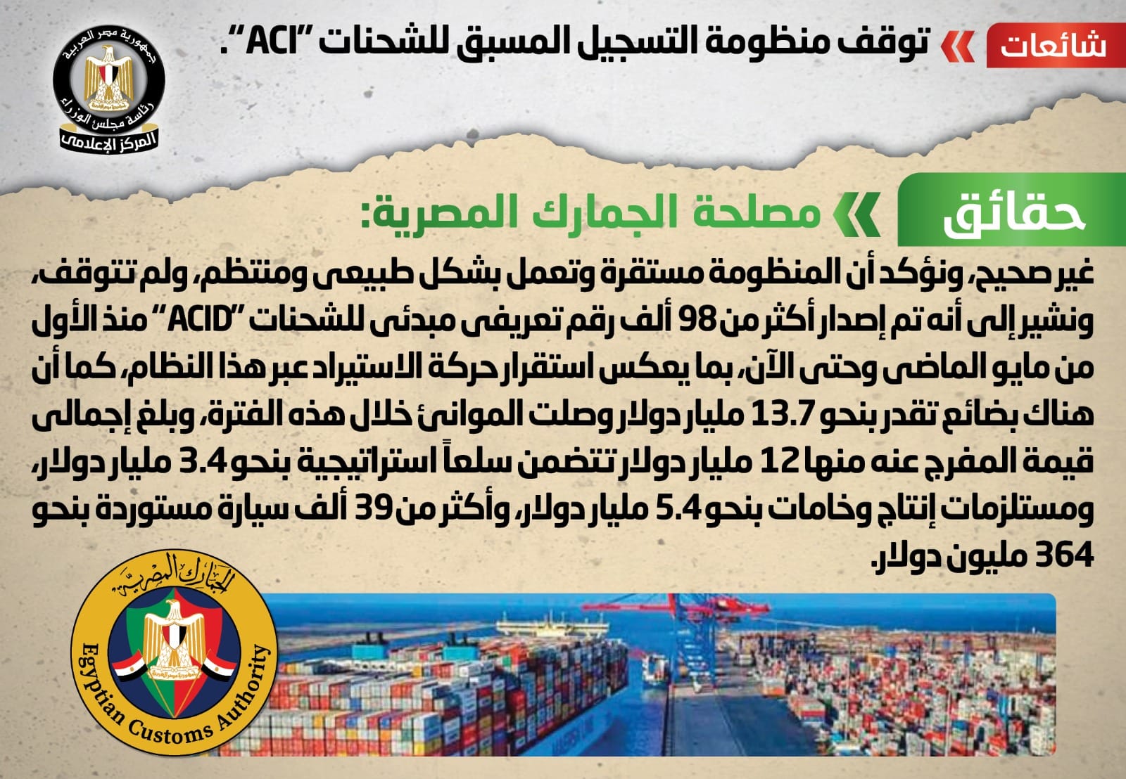 تداولت بعض مواقع التواصل الاجتماعي شائعات بشأن توقف منظومة التسجيل المسبق للشحنات "ACI" وقام المركز الإعلامي لمجلس الوزراء بالتواصل مع مصلحة الجمارك المصرية، مؤكدةً أنه لا صحة لتوقف منظومة التسجيل المسبق للشحنات "ACI".