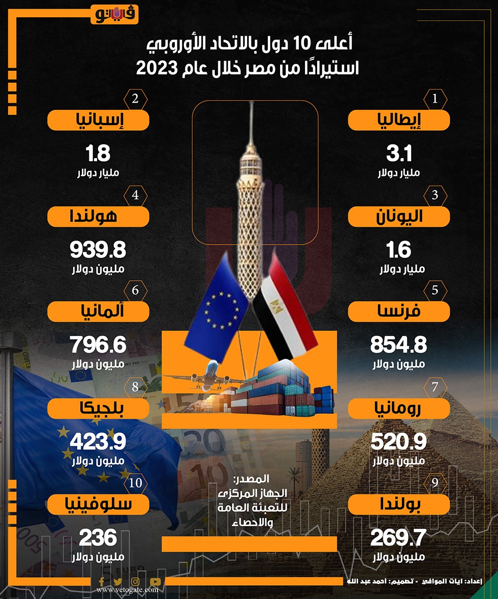 أعلى 10 دول بالاتحاد الأوروبي استيرادًا من مصر خلال عام 2023 (انفوجراف) الإثنين 01/يوليو/2024 - 11:23 ص 7/1/2024 11:23:18 AM الجهاز المركزي للتعبئة والإحصاء، فيتو آيات الموافى شارك طباعة 18 حجم الخط شارك طباعة الجهاز المركزى للتعبئة العامة والإحصاء المركزي للتعبئة العامة والإحصاء الاتحاد الاوربي