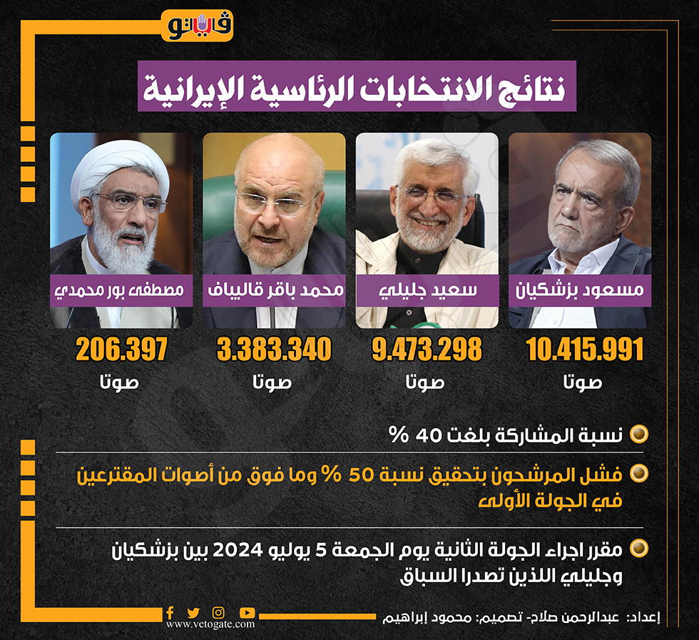 نتائج الانتخابات الرئاسية الإيرانية (إنفوجراف) السبت 29/يونيو/2024 - 02:14 م 6/29/2024 2:14:33 PM الانتخابات الرئاسية الإيرانية، فيتو عبدالرحمن صلاح شارك طباعة 18 حجم الخط شارك طباعة مسعود بزشكيان سعيد جليلي قاليباف إيران انتخابات إيران الانتخابات الرئاسية الإيرانية
