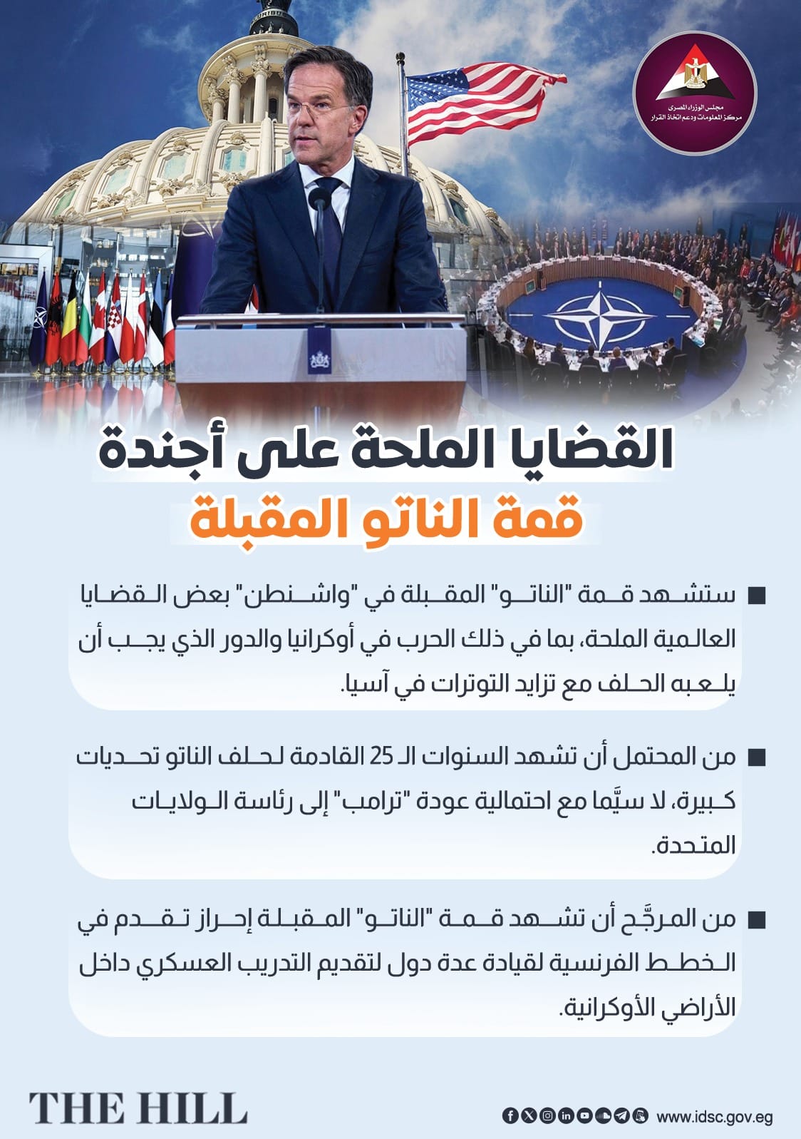 سلَّط مقال نشره موقع "ذا هيل" الضوء على اقتراب انعقاد القمة السنوية لزعماء حلف شمال الأطلسي "الناتو" في "واشنطن" الشهر المقبل، إلى جانب تزايد احتمالات تعيين رئيس الوزراء الهولندي السابق "مارك روته" في منصب الأمين العام لحلف الناتو خلفًا لـ "ينس ستولتنبرج".