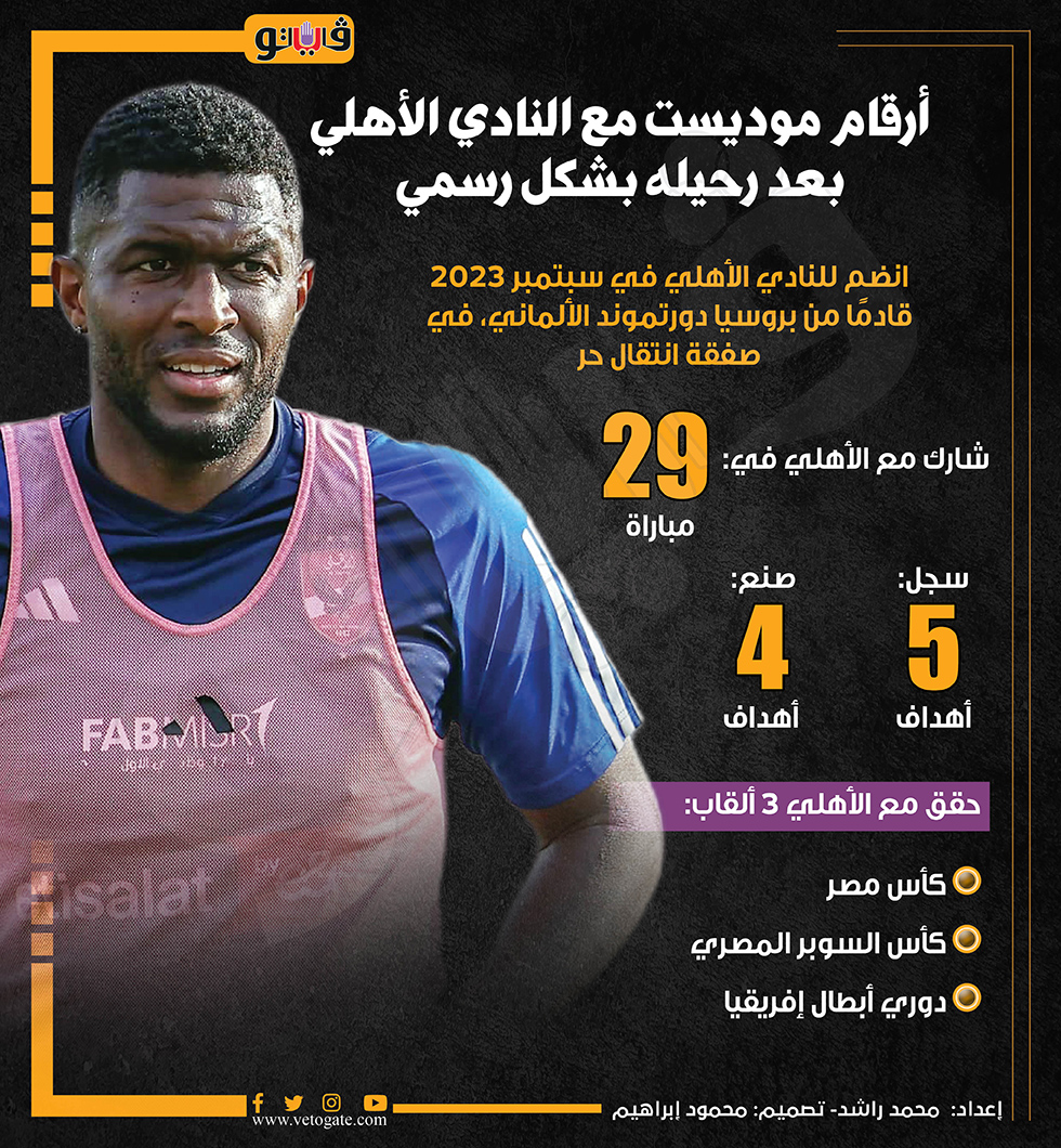 أرقام موديست مع النادي الأهلي بعد رحيله بشكل رسمي (إنفوجراف) السبت 29/يونيو/2024 - 10:00 م 6/29/2024 10:00:19 PM موديست، فيتو محمد راشد شارك طباعة 18 حجم الخط شارك طباعة الأهلي دوري أبطال أفريقيا كأس مصر كأس السوبر المصري موديست أنتوني موديست