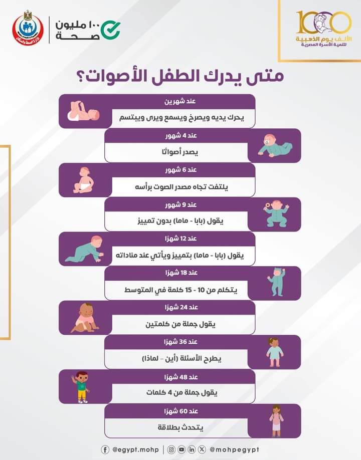 وكشفت وزارة الصحة عن مراحل إدراك الطفل للأصوات منها: “عند عمر شهرين يحرك يديه ويصرخ ويسمع ويرى ويبتسم والطفل عند عمر ٤ شهور يبدأ في إصدار أصوات، وعند عمر ٦ شهور ينبته لمصدر الصوت برأسه، وعند عمر ٩ شهور يقول بابا وماما بدون تمييز وفي عمر ١٢ شهر يبدأ الطفل يقول بابا وماما بتمييز ويأتي عند مناداته”.