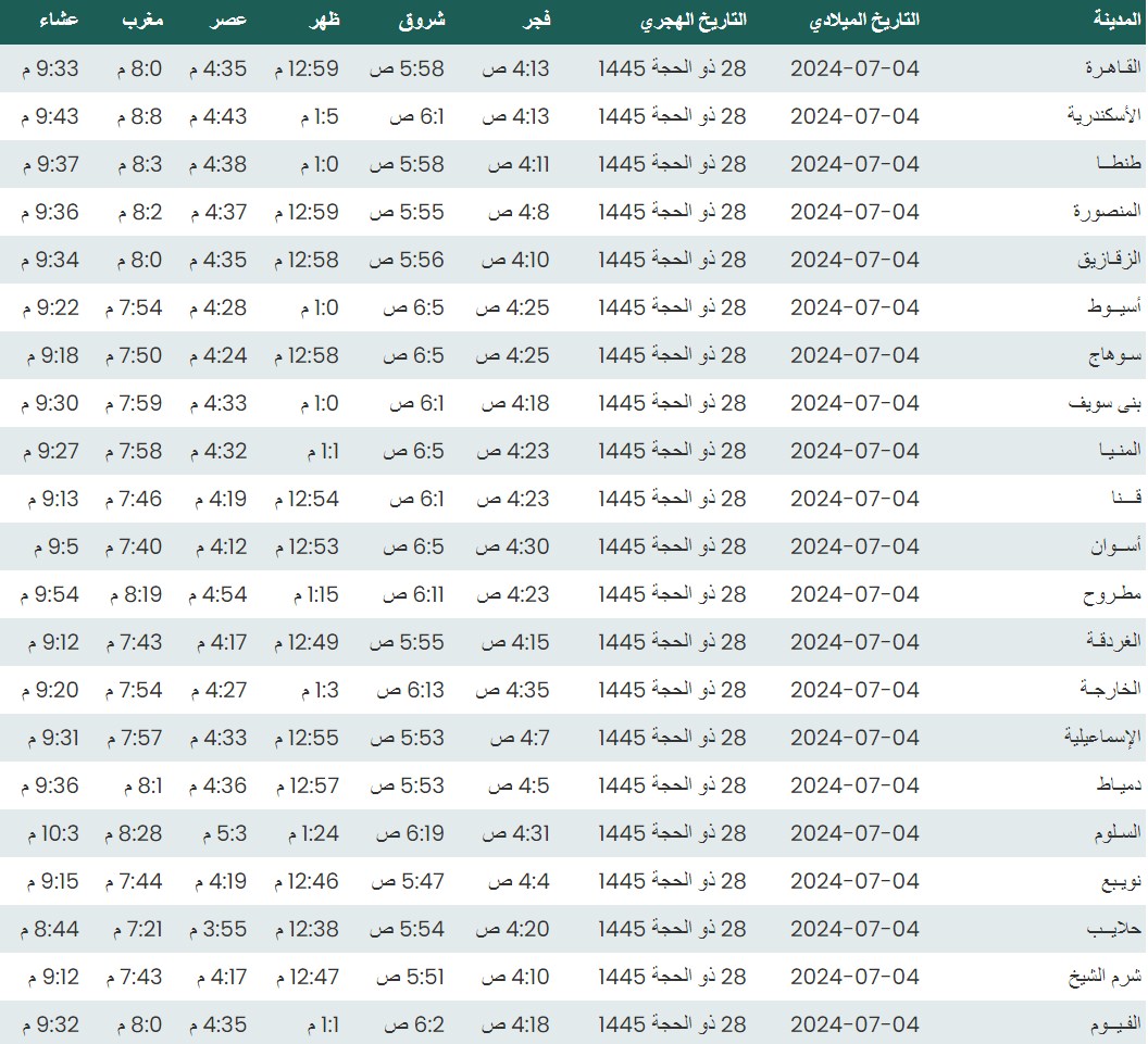 مواقيت الصلاة اليوم وفقًا للتوقيت المحلي لمدينتي القاهرة والإسكندرية وكذلك،مواقيت الصلاة، لعدد من مدن ومحافظات الجمهورية من واقع بيانات الهيئة العامة للمساحة