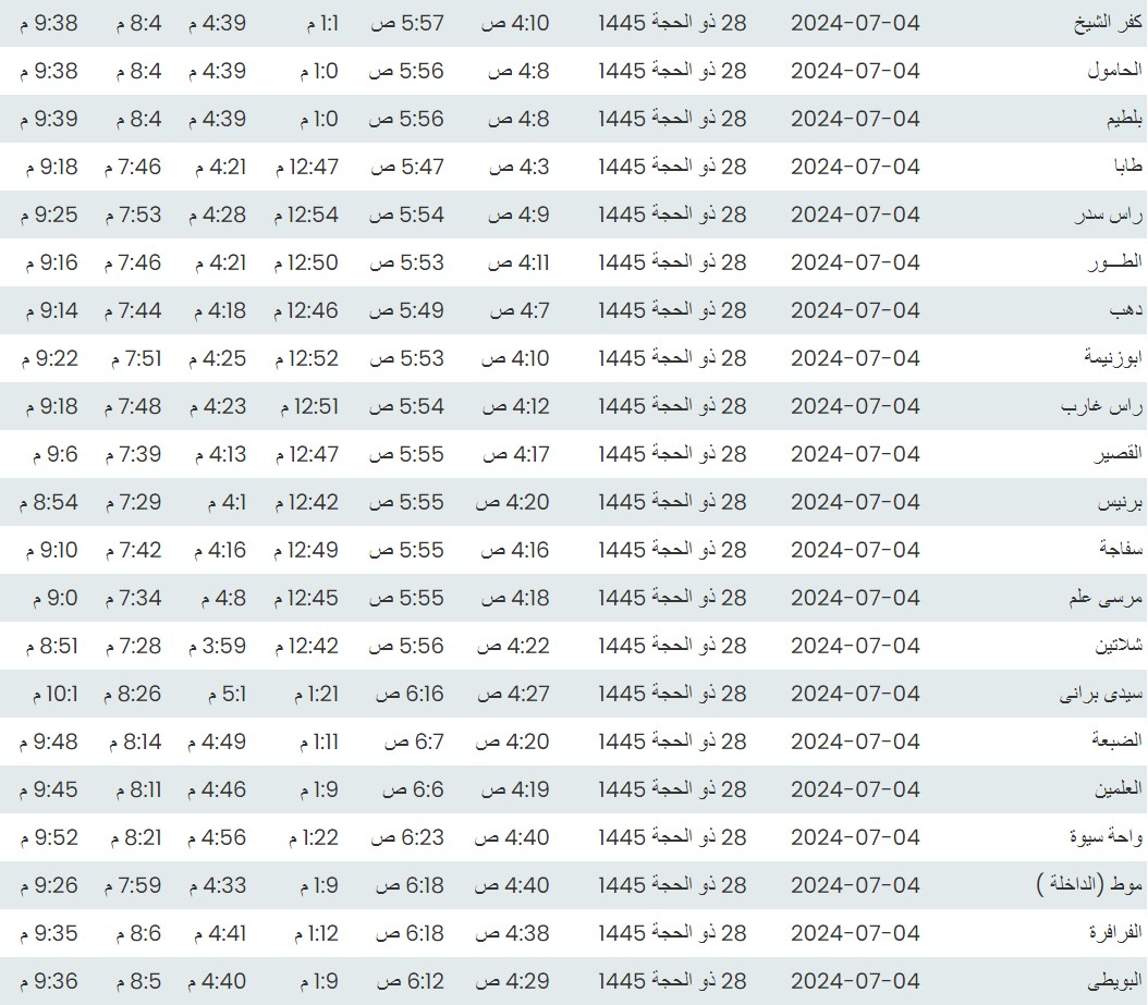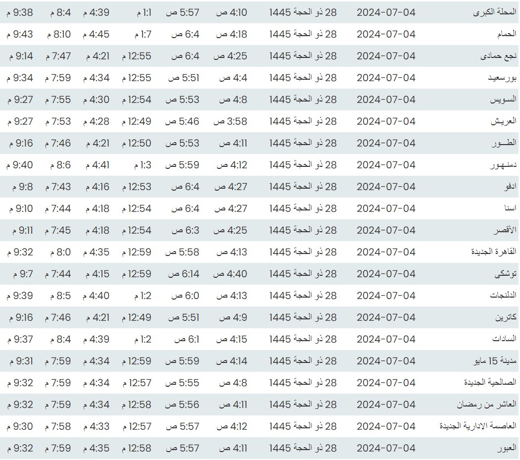 وفيما يلي مواقيت الصلاة، لعدد من مدن ومحافظات الجمهورية من واقع بيانات الهيئة العامة للمساحة