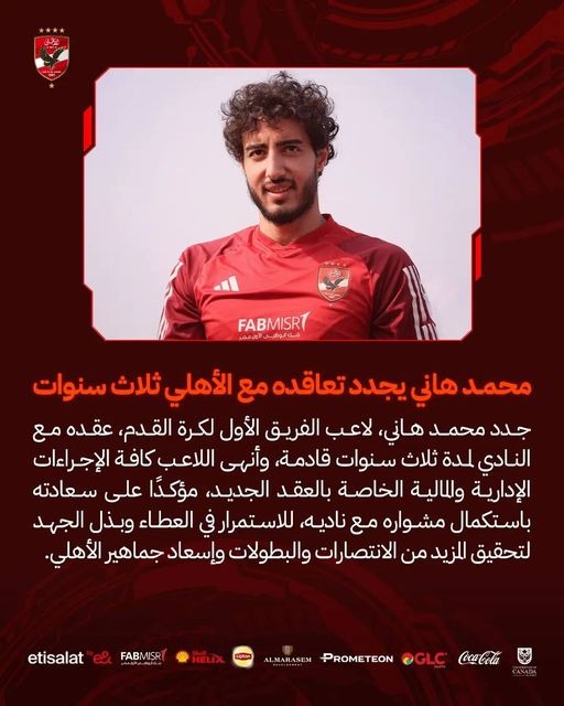 جدد محمد هاني، لاعب الفريق الأول لكرة القدم بالنادي الأهلي، عقده مع القلعة الحمراء لمدة ثلاث سنوات قادمة، وأنهى اللاعب كافة الإجراءات الإدارية والمالية الخاصة بالعقد الجديد.