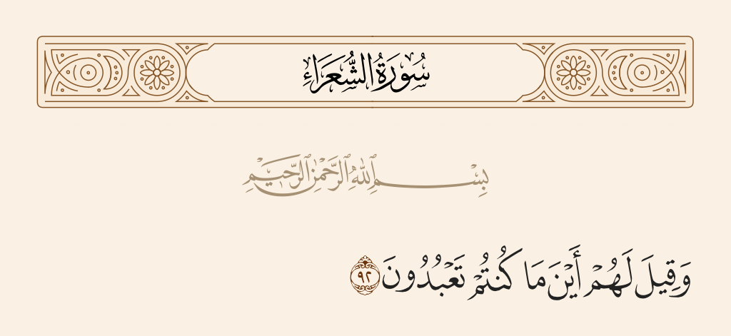 قال الشيخ محمد متولي الشعراوي: قوله تعالى: «أَيْنَ مَا كُنتُمْ تَعْبُدُونَ» [الشعراء: 92] أرونا مَنْ أشركتموهم مع الله، أين هم الآن؟ وفي موضع آخر: «احشروا الذين ظَلَمُواْ وَأَزْوَاجَهُمْ وَمَا كَانُواْ يَعْبُدُونَ مِن دُونِ الله فاهدوهم إلى صِرَاطِ الجحيم وَقِفُوهُمْ إِنَّهُمْ مَّسْئُولُونَ مَا لَكُمْ لاَ تَنَاصَرُونَ» [الصافات: 22- 25]، لقد ضلوا عنكم، وتركوكم، بل وتبرأوا منكم: «إِذْ تَبَرَّأَ الذين اتبعوا مِنَ الذين اتبعوا وَرَأَوُاْ العذاب وَتَقَطَّعَتْ بِهِمُ الأسباب» [البقرة: 166].