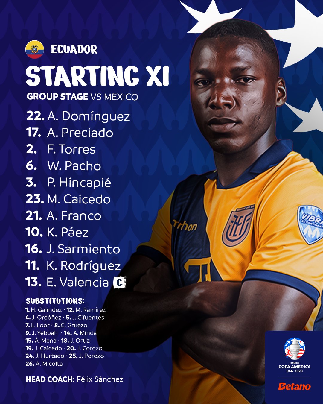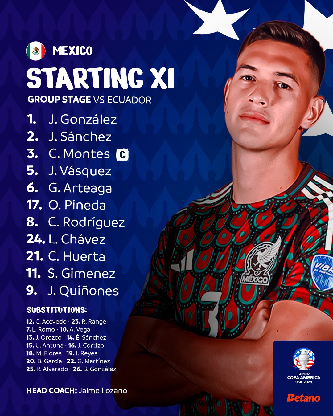 وكان قد أعلن خايمي لوزانو مدرب المنتخب المكسيكي، وفيليكس سانشيز مدرب منتخب الإكوادور، تشكيل فريقيهما للمواجهة التي جمعتهما صباح اليوم الإثنين على ملعب جامعة فينيكس في منافسات الجولة الأخيرة من دور المجموعات بكوبا أمريكا 2024.