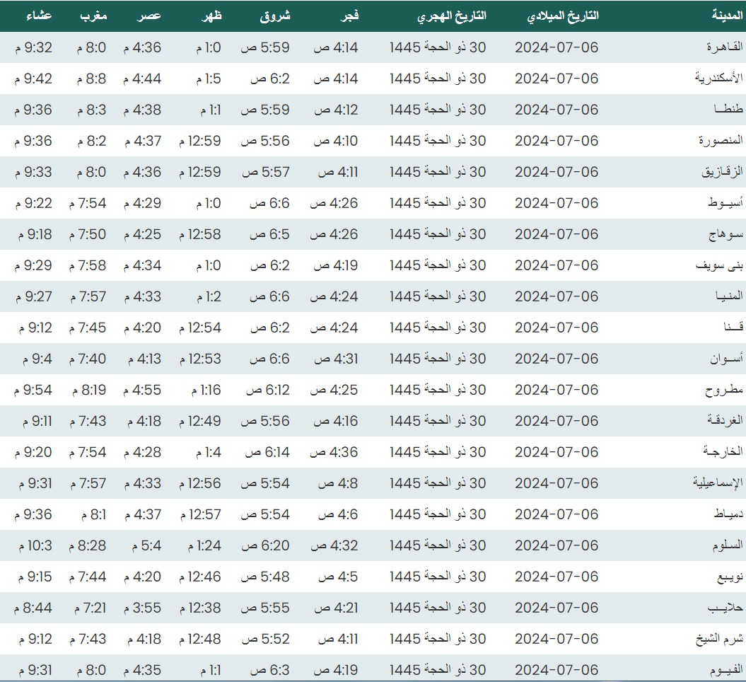 مواقيت الصلاة اليوم وفقًا للتوقيت المحلي لمدينتي القاهرة والإسكندرية وكذلك،مواقيت الصلاة، لعدد من مدن ومحافظات الجمهورية من واقع بيانات الهيئة العامة للمساحة