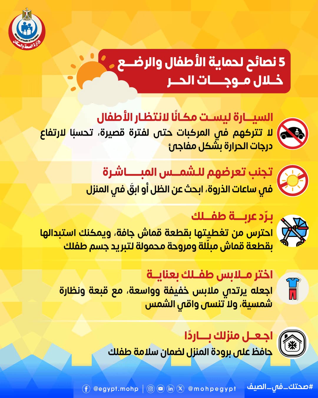 وجهت وزارة الصحة نصائح لحماية الأطفال والرضع من آشعة الشمس خلال الموجة الحارة.
