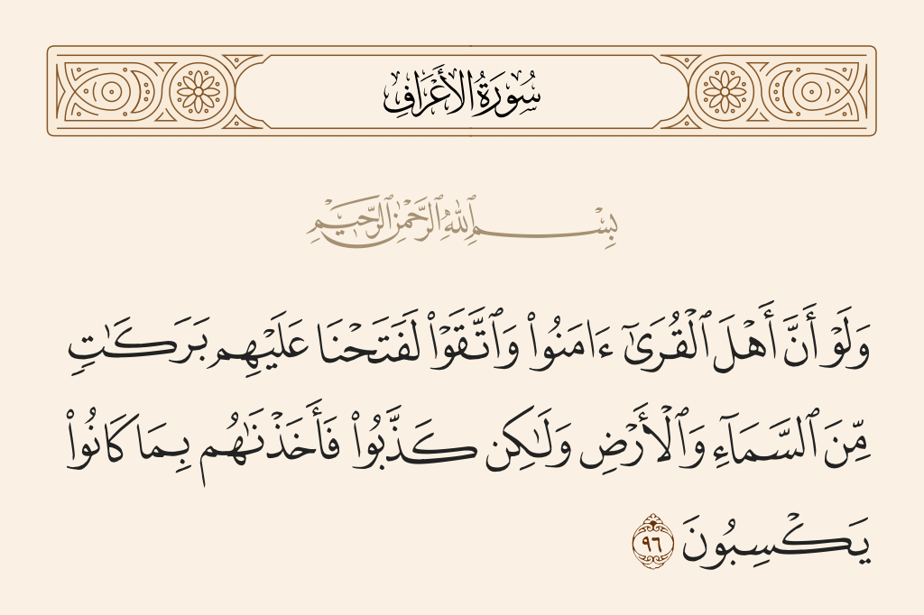 قال تعالى: «وَلَوْ أَنَّ أَهْلَ الْقُرَى آمَنُوا وَاتَّقَوْا لَفَتَحْنَا عَلَيْهِمْ بَرَكَاتٍ مِنَ السَّمَاءِ وَالْأَرْضِ وَلَكِنْ كَذَّبُوا فَأَخَذْنَاهُمْ بِمَا كَانُوا يَكْسِبُونَ».