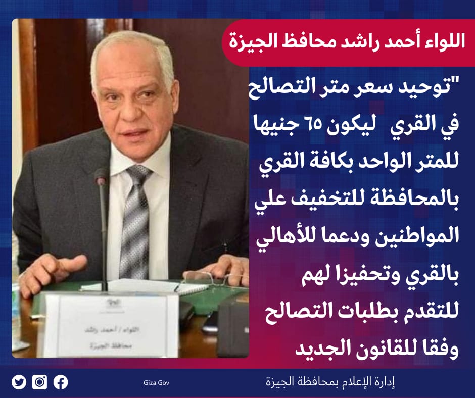 وأشار محافظ الجيزة أنه تقرر توحيد سعر متر التصالح بكافة القرى في المحافظة بقيمة ٦٥ جنيهًا للمتر الواحد وهو الحد الأدنى الذي نص عليه القانون، وذلك تخفيفًا عن كاهل المواطنين ودعمًا لأهالي القرى وتحفيزا لهم للتقدم بطلبات للتصالح في مخالفات البناء.