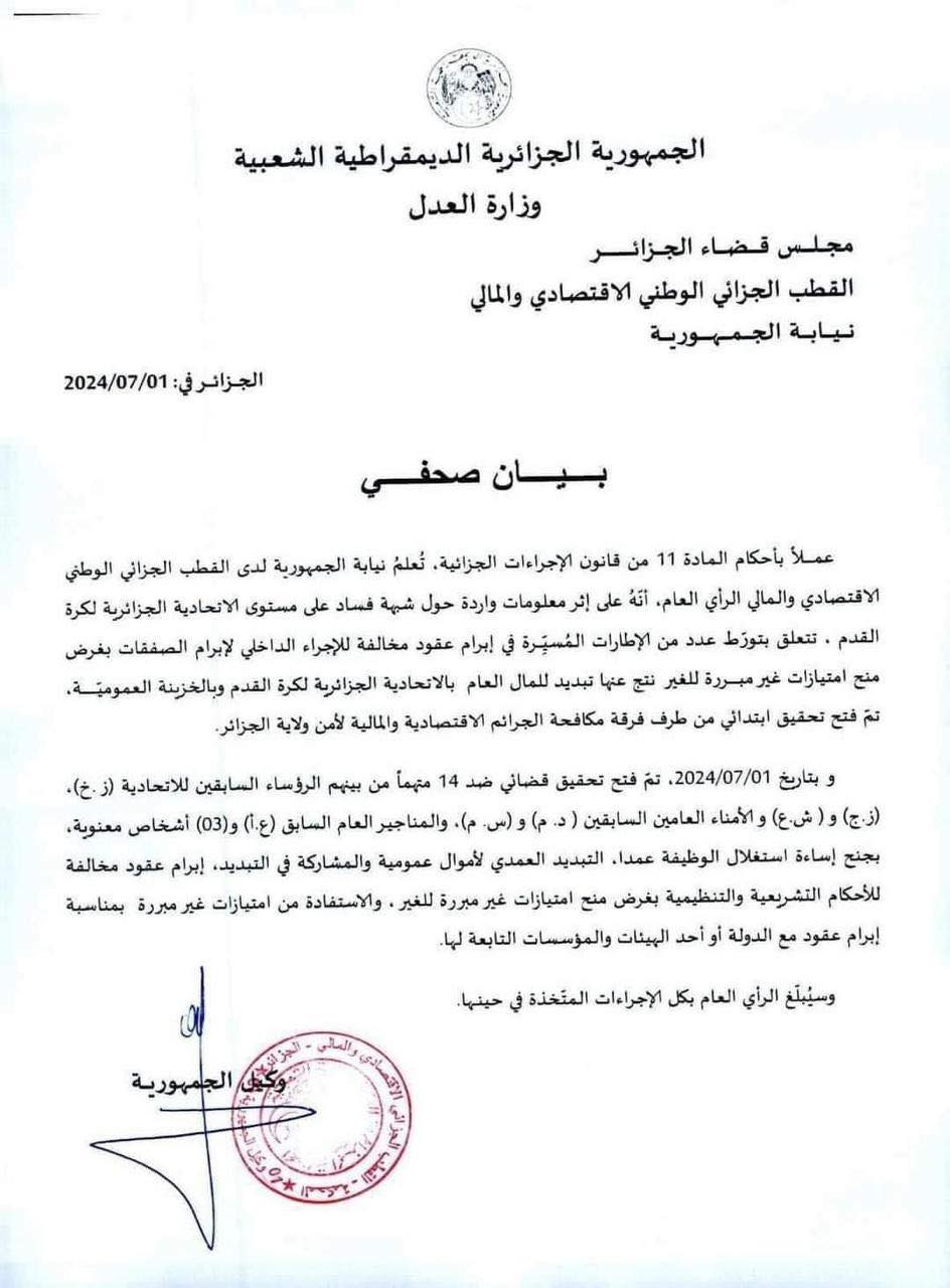 بالأمس أصدرت وزارة العدل الجزائرية بيانا صحفيا أعلنت فيه فتح تحقيق قضائي ضد 14 متهما من بينهم رؤساء سابقين للاتحاد وأمناء عامون سابقون ومدير عام سابق وثلاثة أشخاص معنوية بجنح إساءة استغلال الوظيفة عمدا والتبديد العمدي لأموال عمومية والمشاركة في التبديد وإبرام عقود مخالفة للأحكام التشريعية والتنظيمية بغرض منح امتيازات غير مبررة للغير.