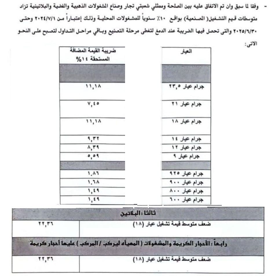 وأوضحت الشعبة العامة للذهب أن قيمة ضريبة القيمة المضافة على المشغولات الذهبية حتى 30 يونيو 2025، وأنه تم الاتفاق بين الشعبة ومصلحة الضرائب على زيادة متوسطات قيم التشغيل «المصنعية» بواقع 10% سنويًا، التي تحمل فيها الضريبة عند الدمغ لتغطي مرحلة التصنيع، وباقى مراحل التداول.