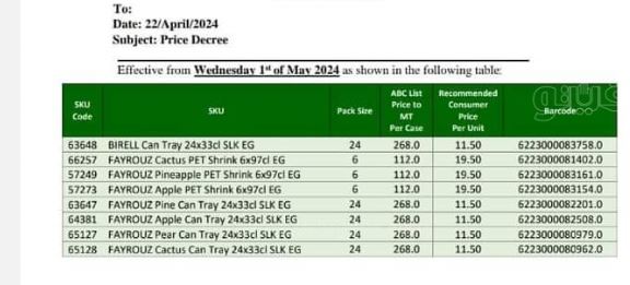 وبمقارنة سعر بيريل وفيروز الذي سيطبق في 15 يوليو الجاري؛ بسعرها السابق يتضح أن الشركة قررت رفع سعر المنتجات ما بين جنيهين و3 جنيهات.