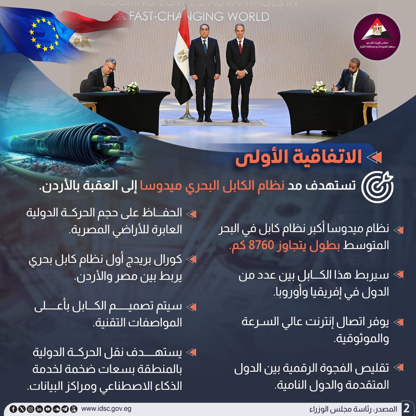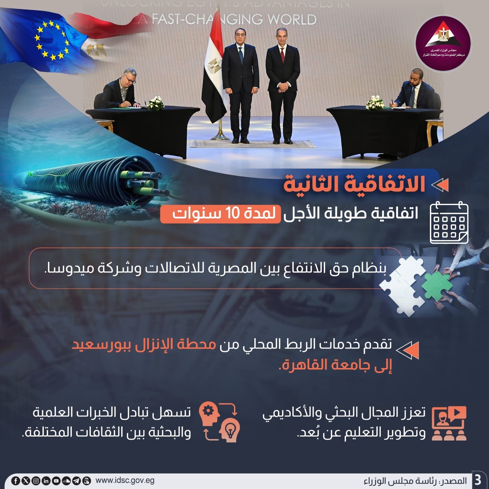 حيث شهد الدكتور مصطفى مدبولي، رئيس مجلس الوزراء، توقيع اتفاقيتين تجاريتين بين الشركة المصرية للاتصالات، الشركة الرائدة في مجال تقديم خدمات الاتصالات وتكنولوجيا المعلومات في مصر وأحد أكبر مشغلي الكابلات البحرية في المنطقة، وشركة ميدوسا، وهي شركة أوروبية خاصة مستقلة ومحايدة لتشغيل أنظمة البنية التحتية البحرية في منطقة البحر المتوسط وتديرها شركة "AFR-IX Telecom".