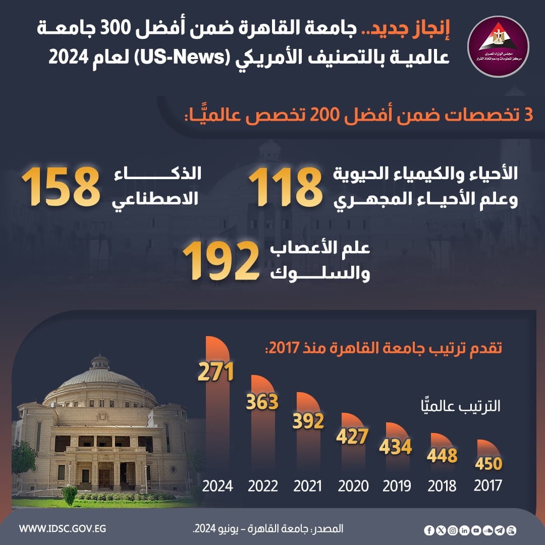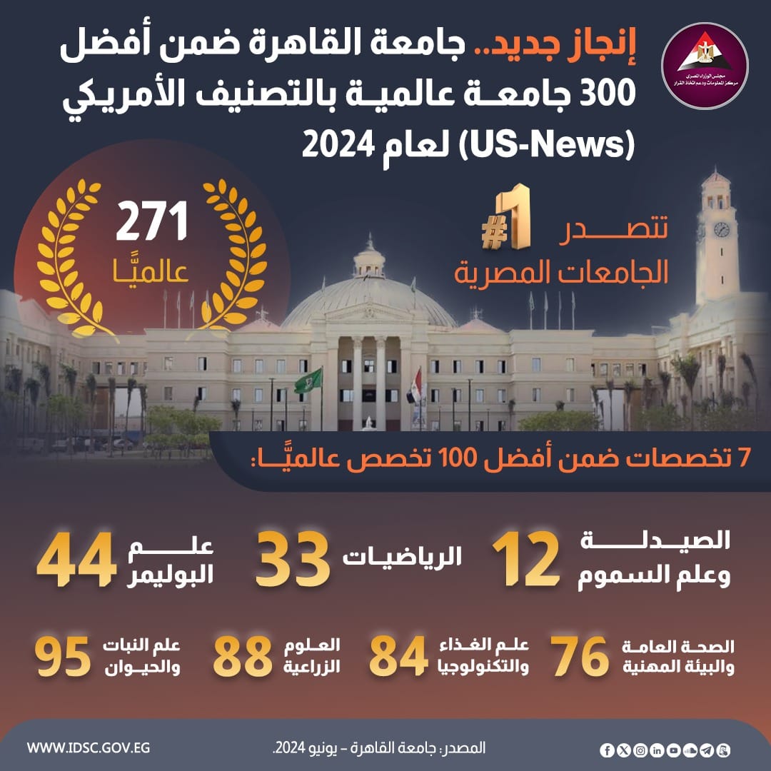جامعة القاهرة بين قائمة الـ300 الأفضل عالميا بالتصنيف الأمريكي 2024 (إنفوجراف)