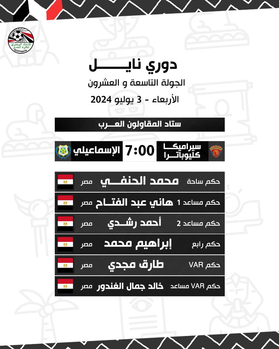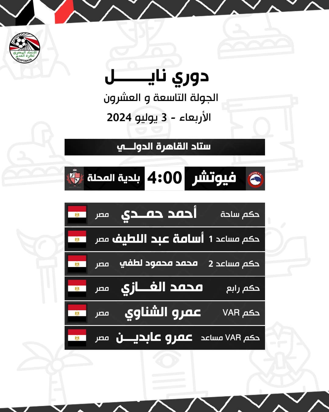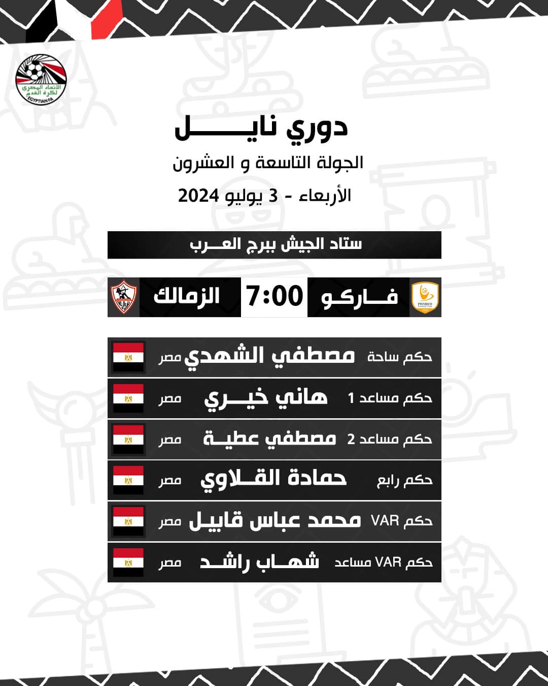 الدوري المصري، أعلنت لجنة الحكام الرئيسية باتحاد الكرة، أسماء حكام مباريات اليوم الأربعاء، ضمن مواجهات الدوري المصري الممتاز، وجاءت على النحو التالي: