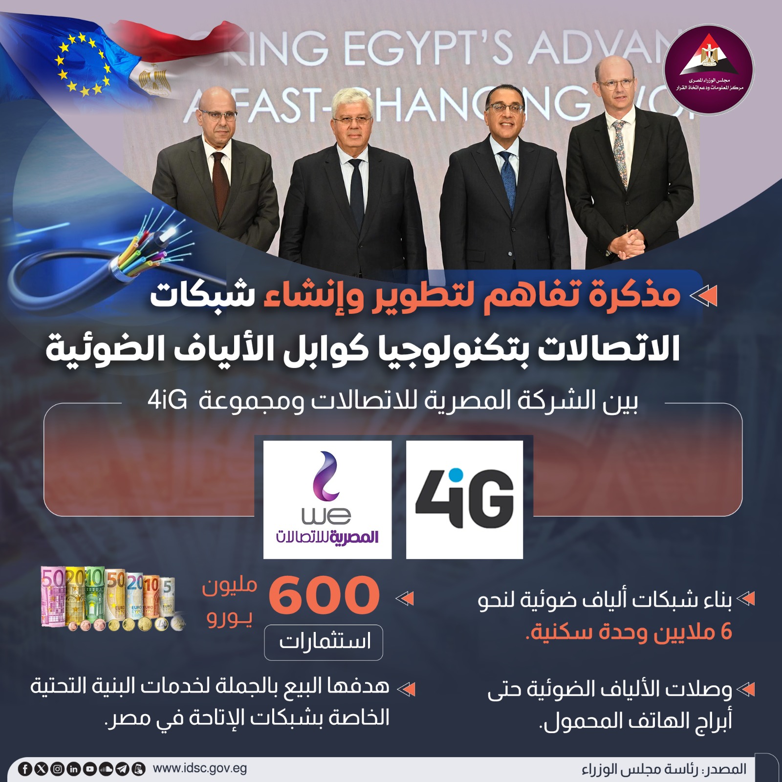 حيث وقعت الشركة المصرية للاتصالات ومجموعة 4iG، مذكرة تفاهم بشأن مشروع بناء وتشغيل شبكات الألياف الضوئية حتى المنزل جاء ذلك على هامش مؤتمر الاستثمار المصري الأوروبي المشترك الذي استضافته مصر على مدار يومين.